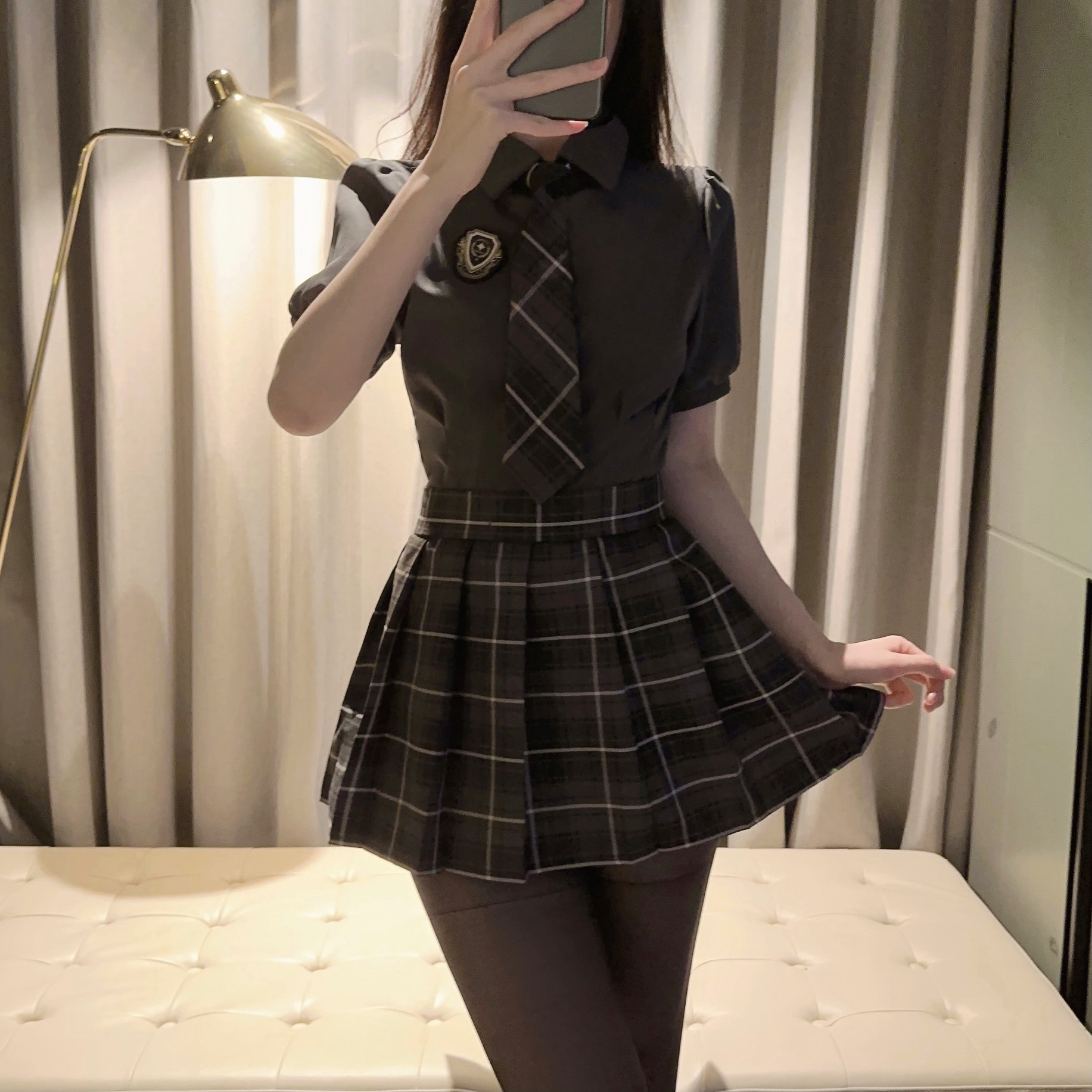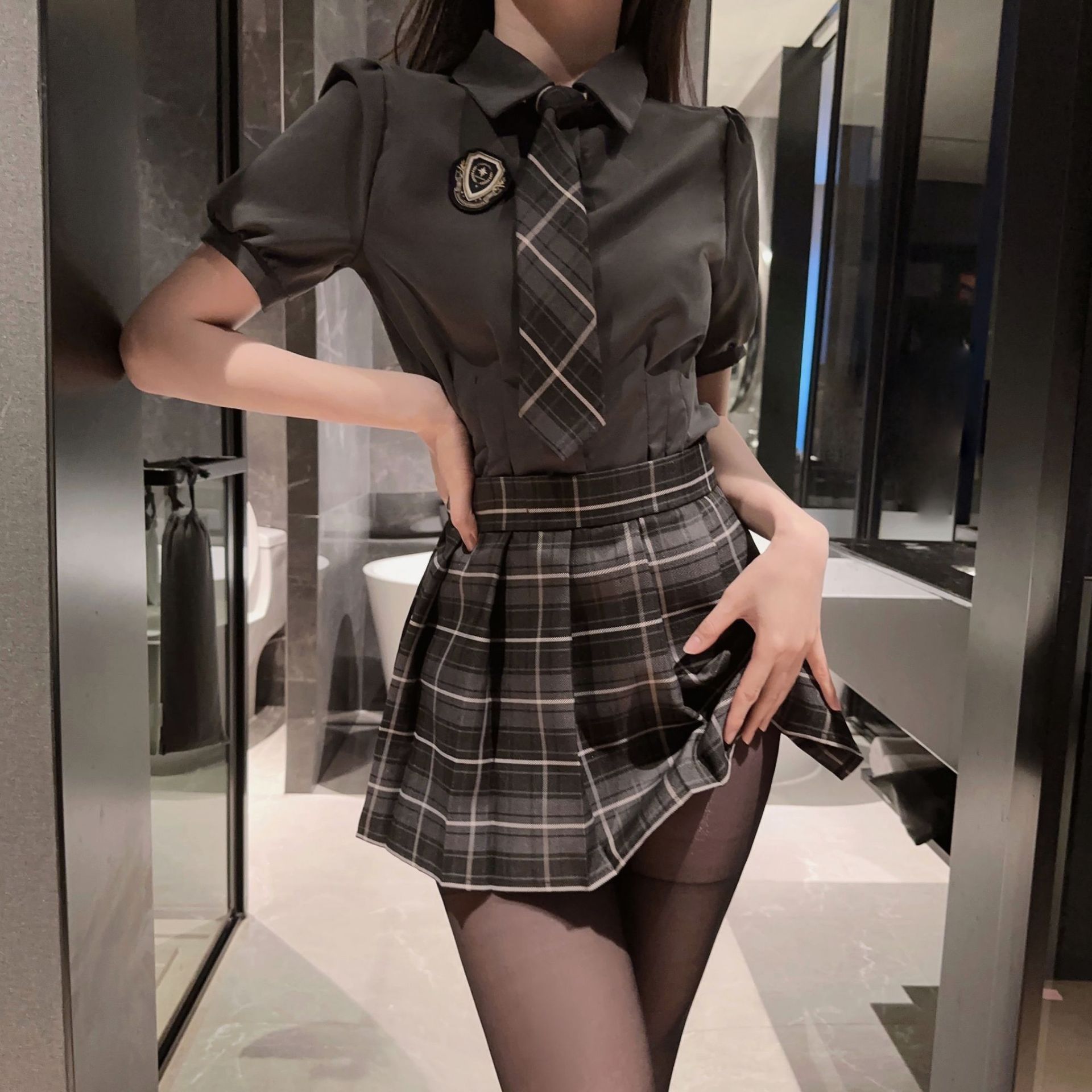 灰色短袖衬衫+徽章+裙子