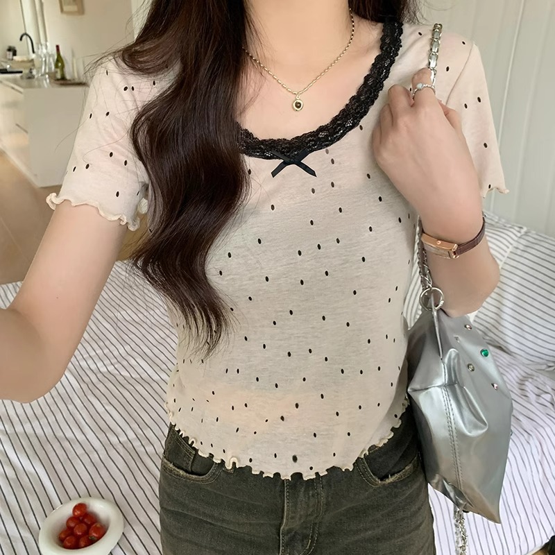 波点短袖t恤女春夏新款内搭设计感圆领蕾丝边洋气修身纯欲短上衣