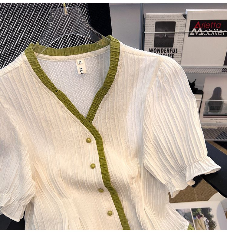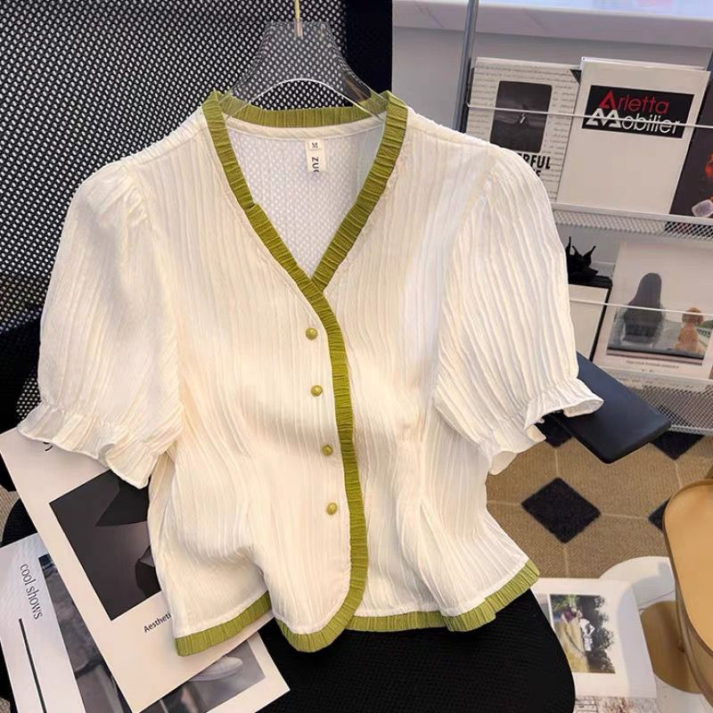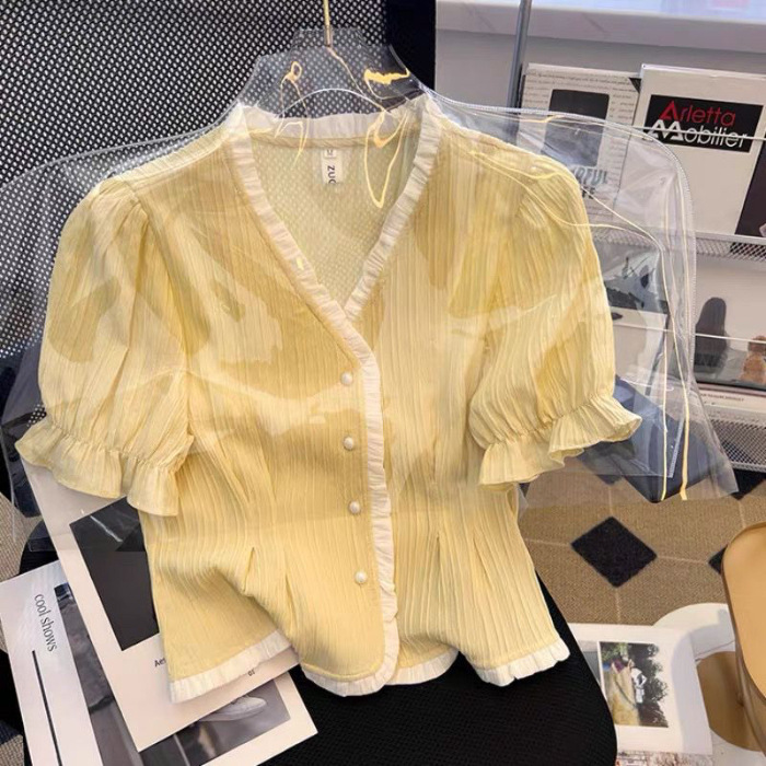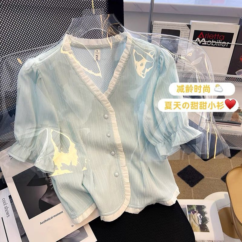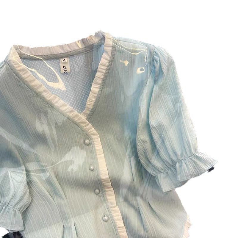 高级感法式V领蓝色短袖衬衫女夏季设计感小众别致雪纺泡泡袖上衣
