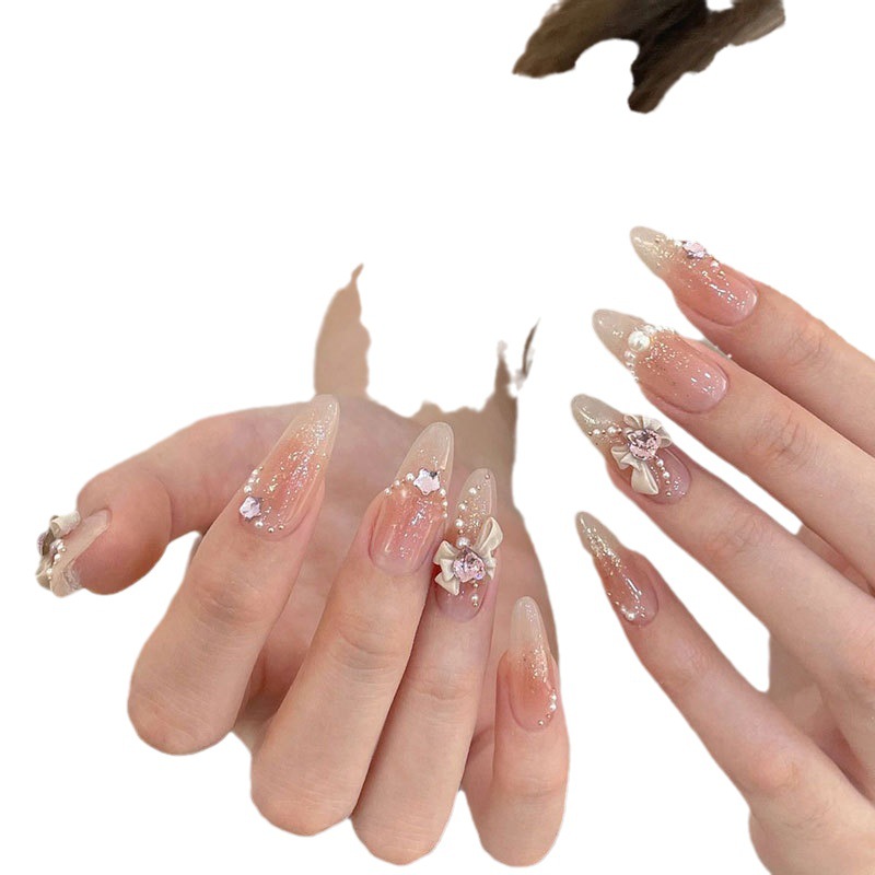 纯手工美甲穿戴甲指甲贴高级轻奢腮红闪钻蝴蝶结冰透裸色珍珠闪粉