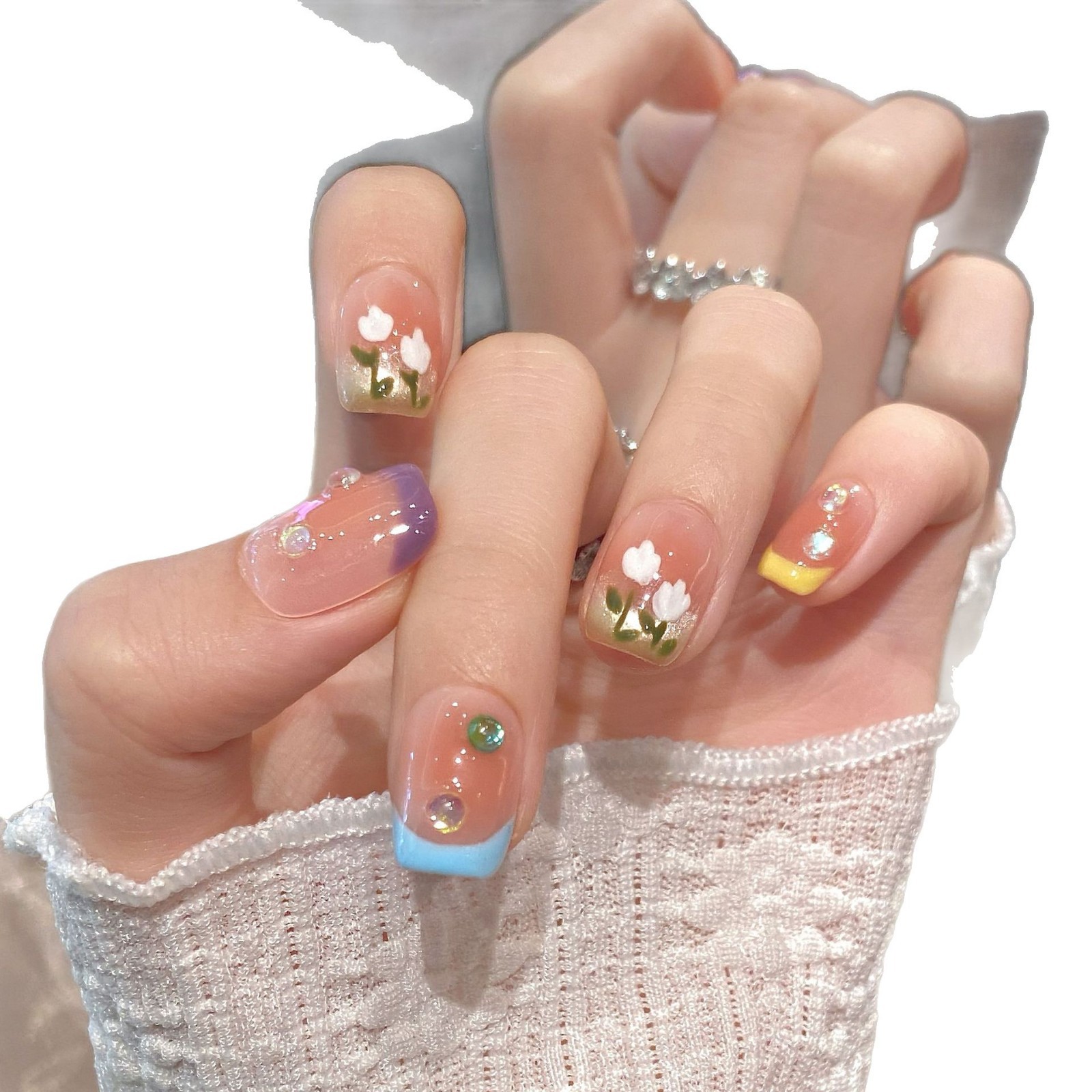 艺禾美甲 春夏新款马卡龙短款手绘油画郁金香渐变猫眼手工穿戴甲