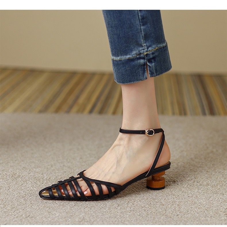 小众法式复古尖头镂空中跟粗跟包头时装凉鞋女