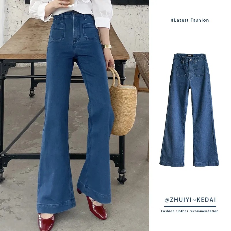 港风法式喇叭牛仔裤女深蓝色复古高腰显瘦垂坠感阔腿长裤子ins潮