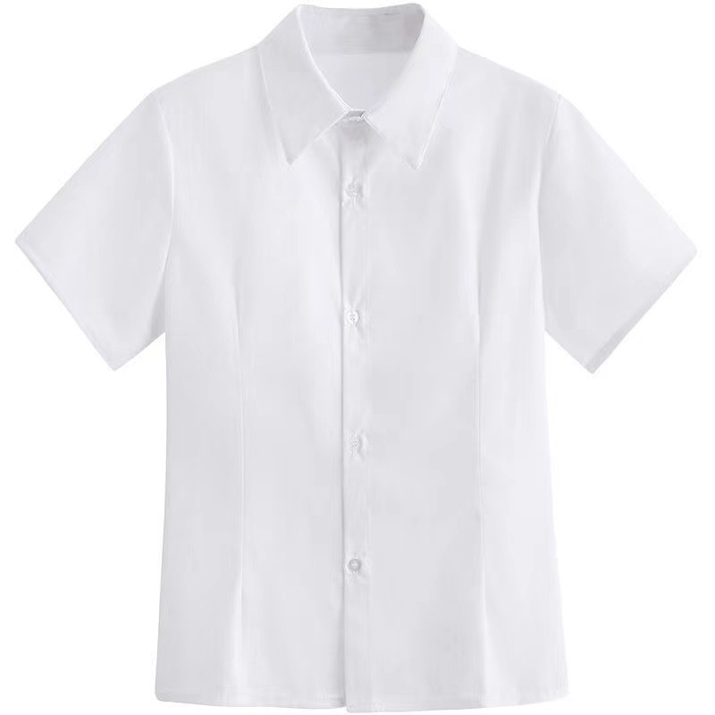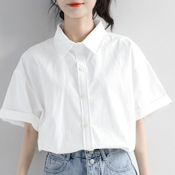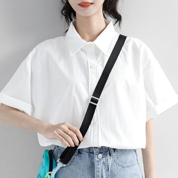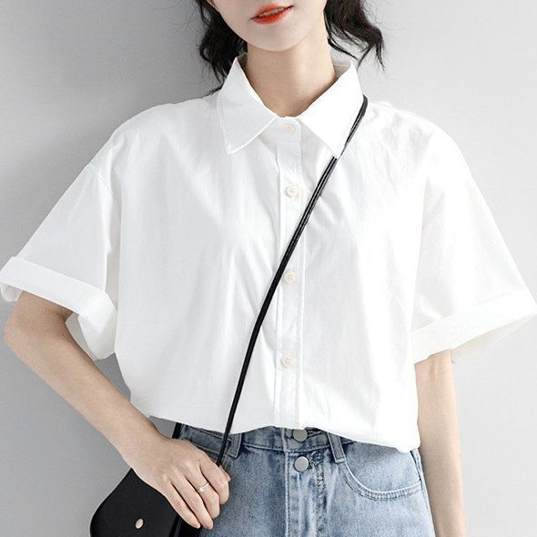 纯白基础款方领夏季白色工装短袖衬衫女夏宽松韩版上衣百搭衬衫