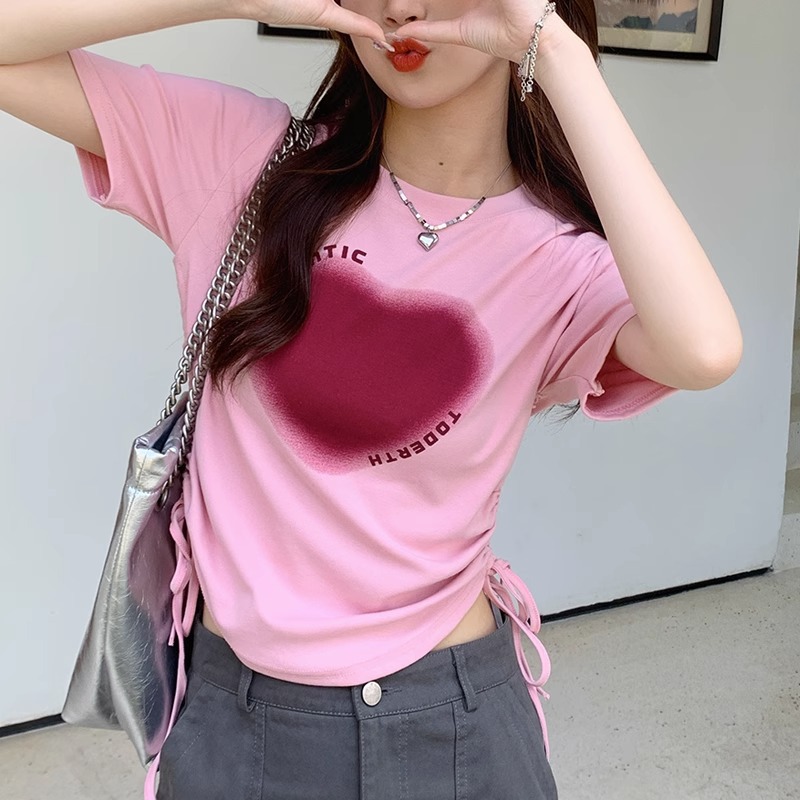 短款女上衣夏季新款甜辣风高腰印花短袖体桖小众抽绳纯棉正肩T恤