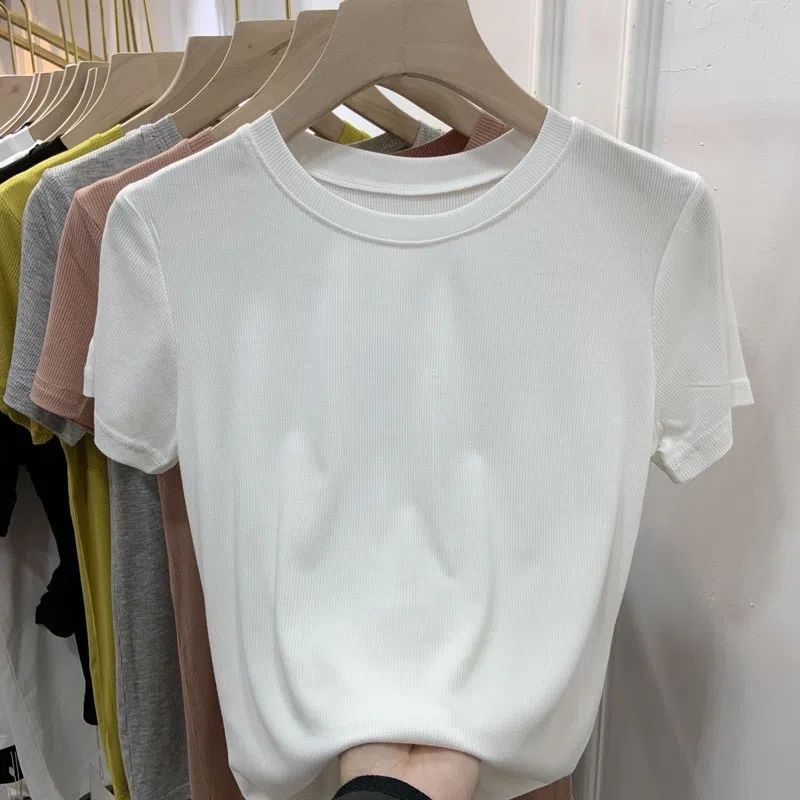 超手感短款莫代尔t恤女小众夏季修身显瘦圆领短袖纯色打底衫