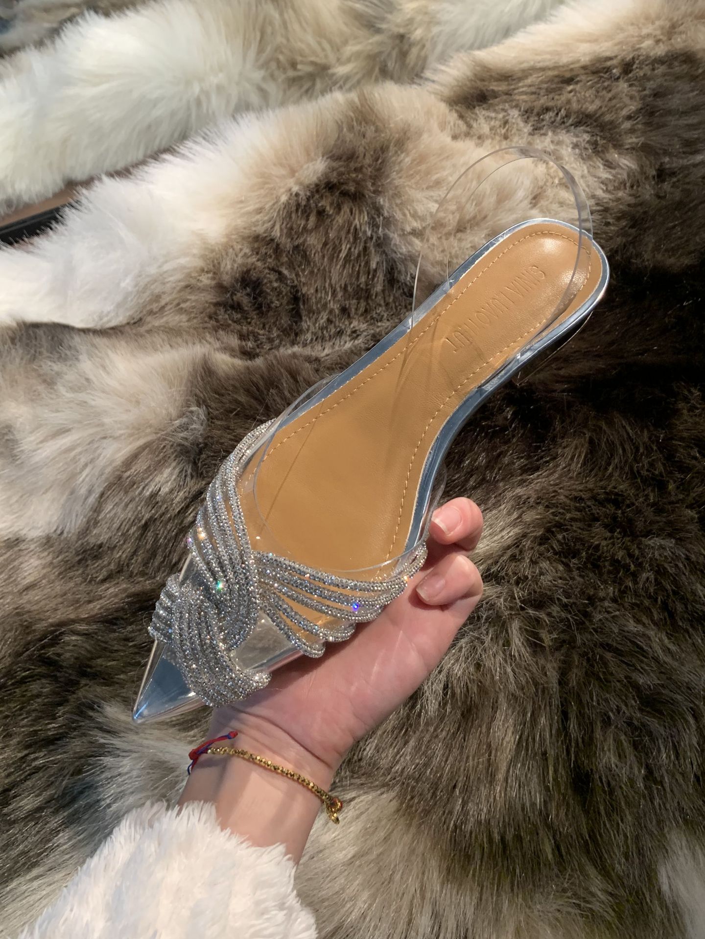 夏季仙女风透明水钻尖头平底低跟鞋外穿半拖鞋女包头凉鞋凉拖