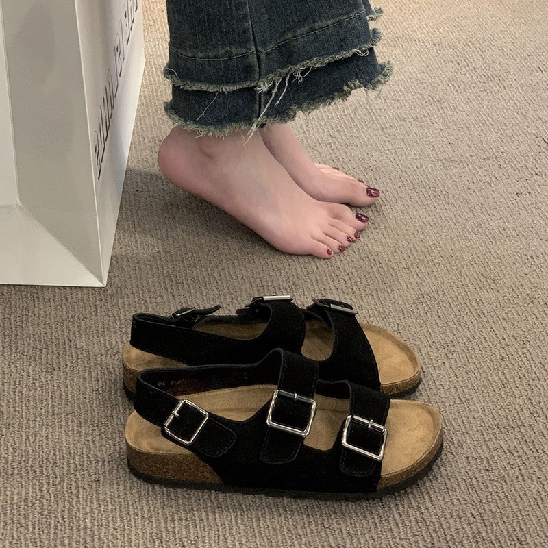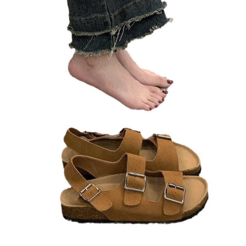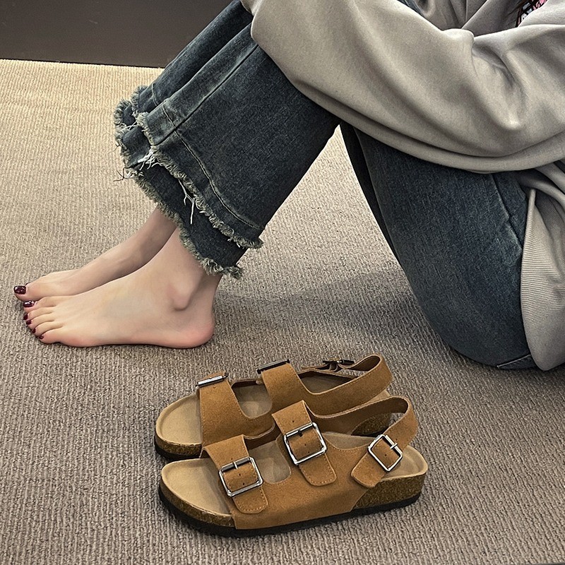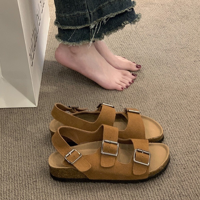 复古磨砂厚底露趾凉鞋女夏季新款懒人金属扣带平底休闲沙滩鞋