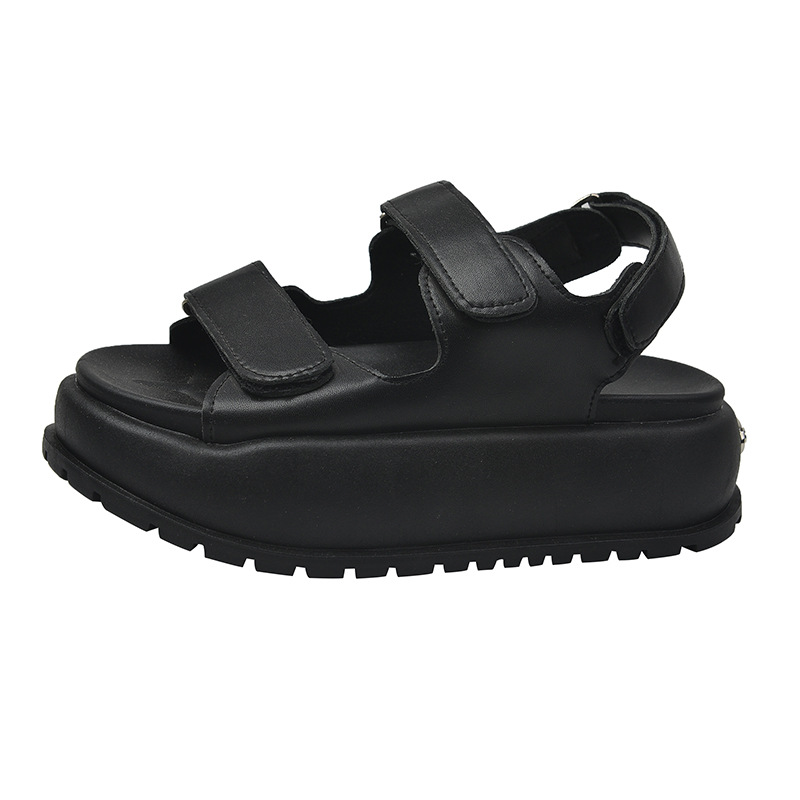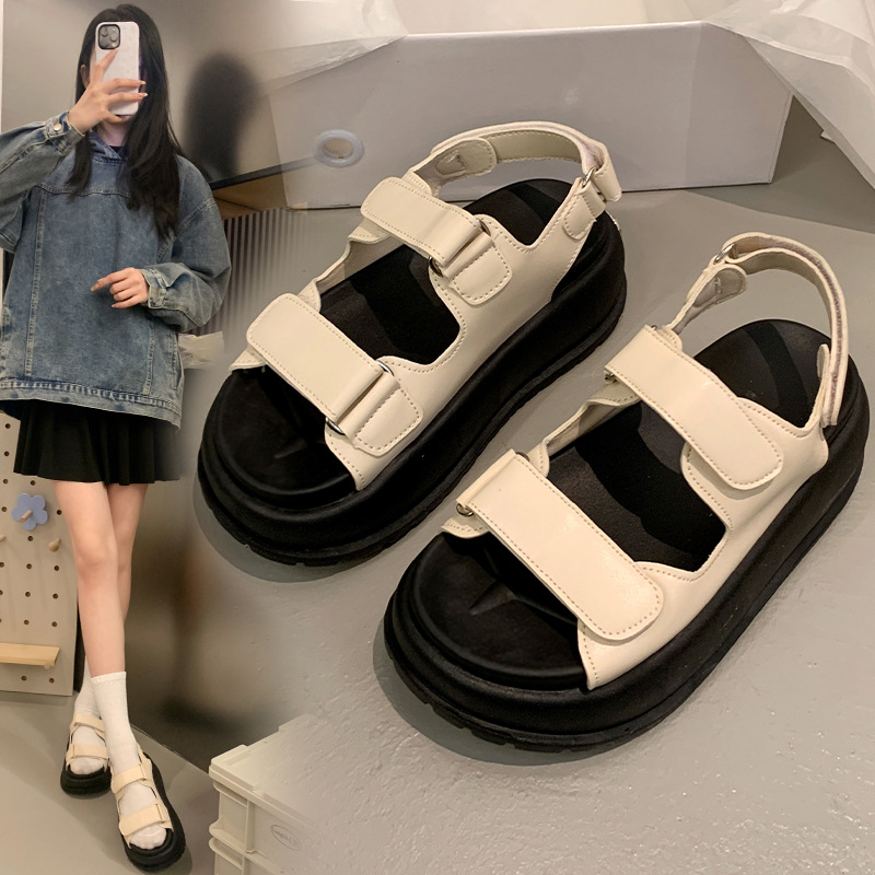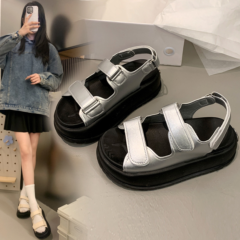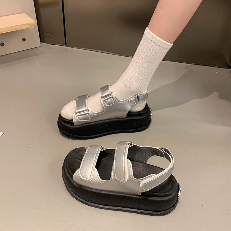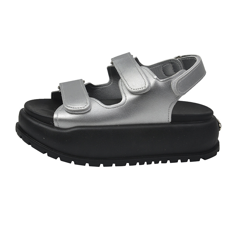 7cm厚底魔术贴运动凉鞋女年夏季新款银色一字扣带沙滩罗马鞋
