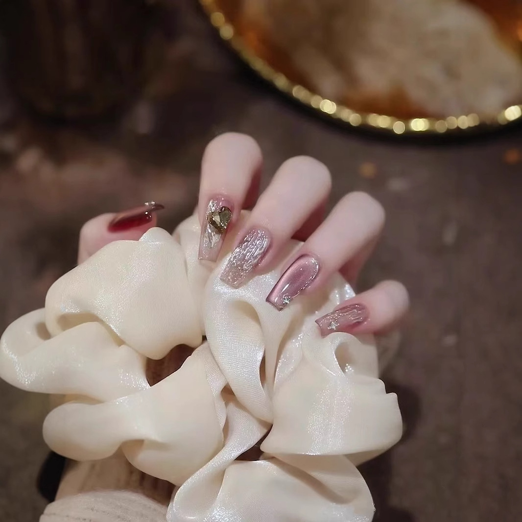 手工穿戴甲爆款美拉德猫眼玻璃珠甲片爱心钻爆闪高级感显白美甲贴
