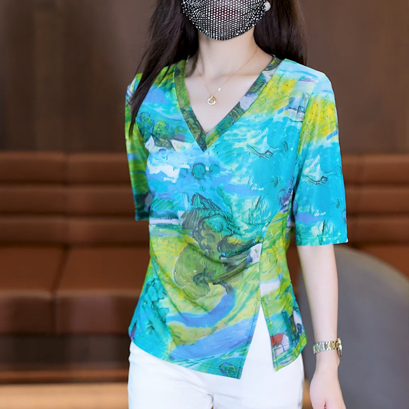 复古艺术印花网纱上衣女五分袖夏季新款宽松大码中袖开叉小衫
