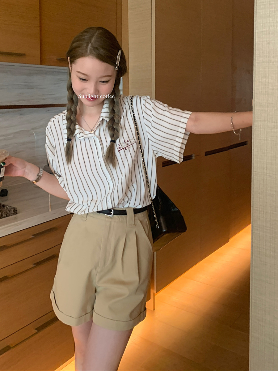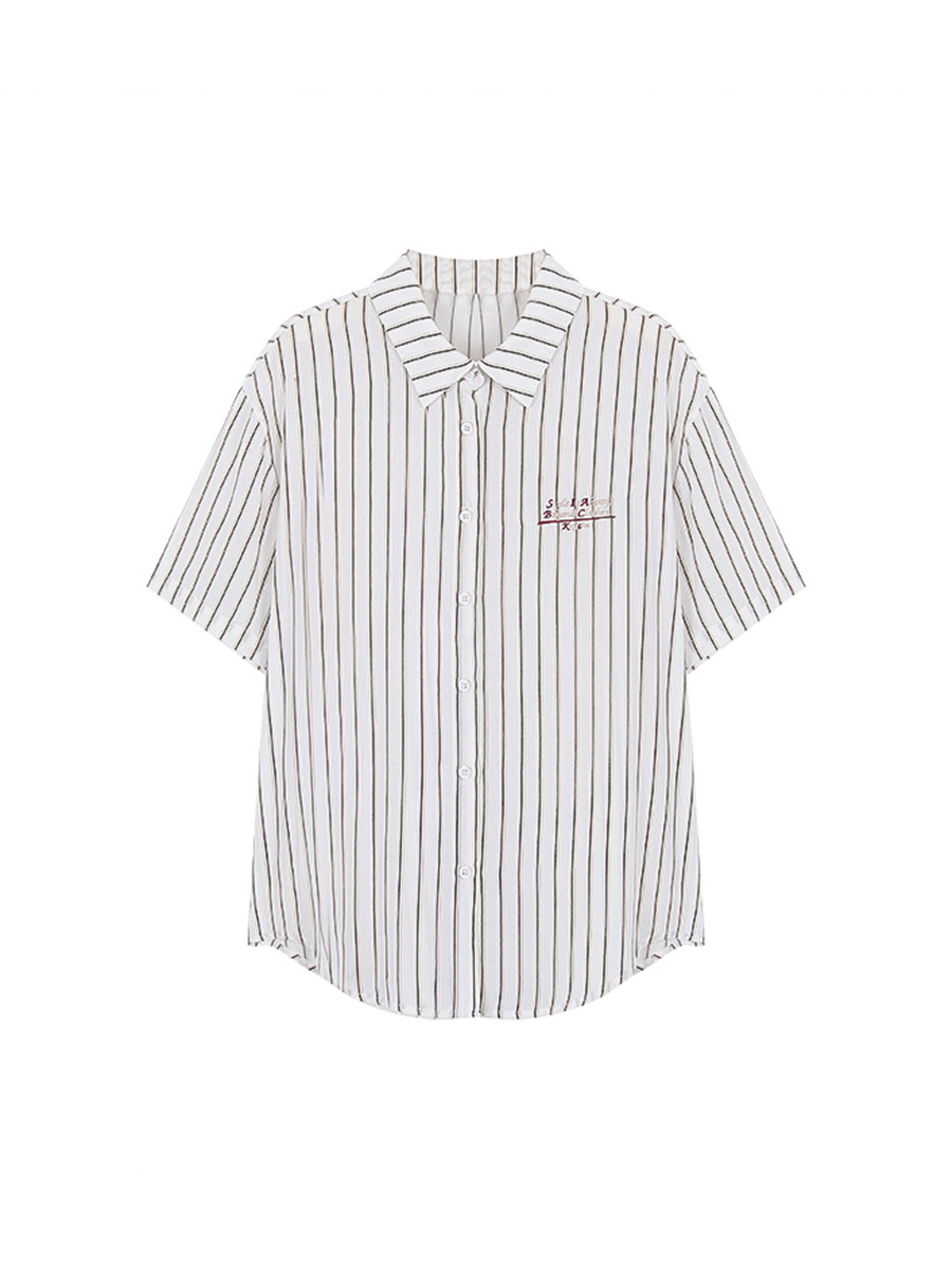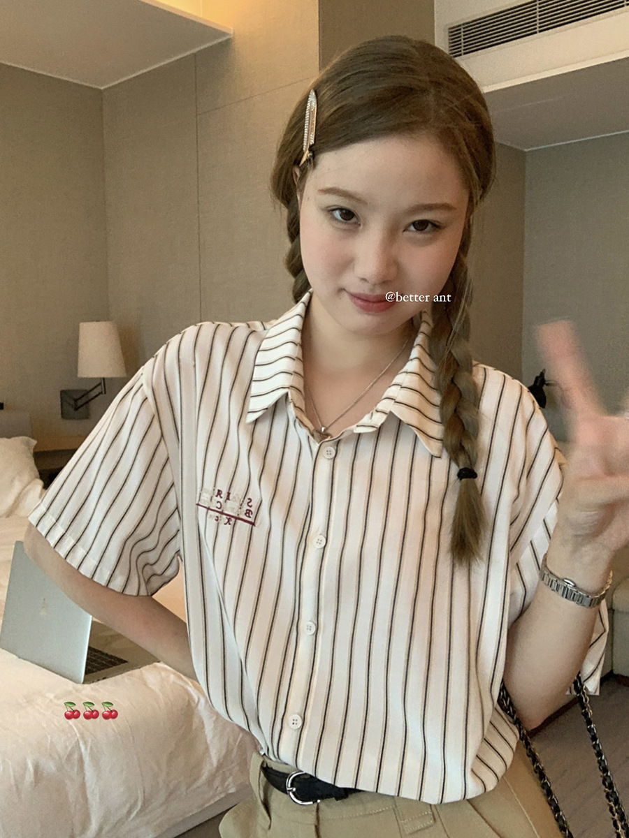 设计感小刺绣条纹短袖衬衫女夏季新款休闲通勤上衣