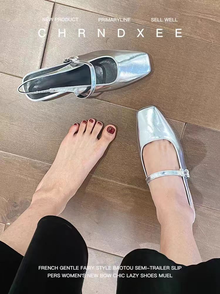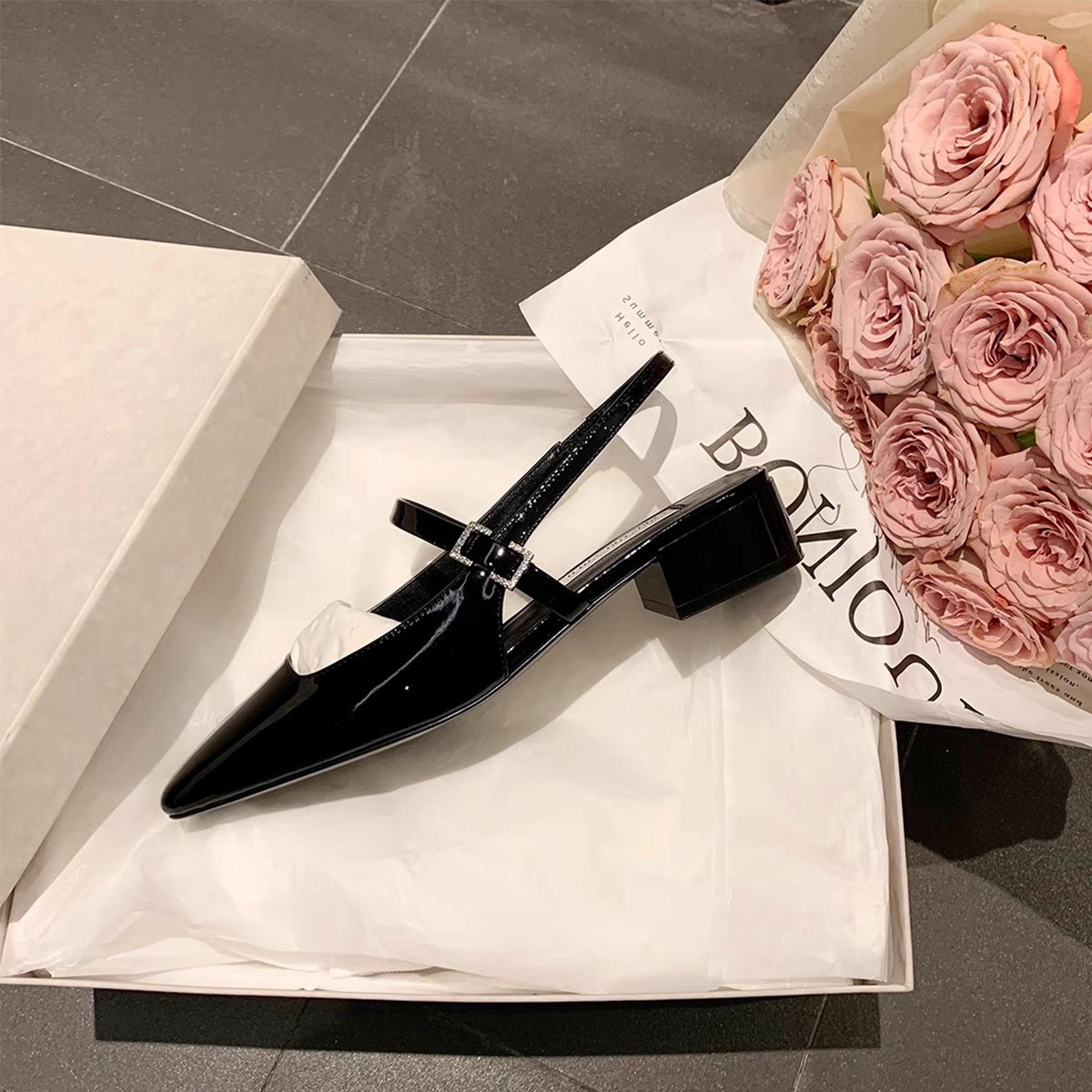 法式方头玛丽珍鞋春季新款水钻方扣粗跟凉鞋女一字扣后空单鞋