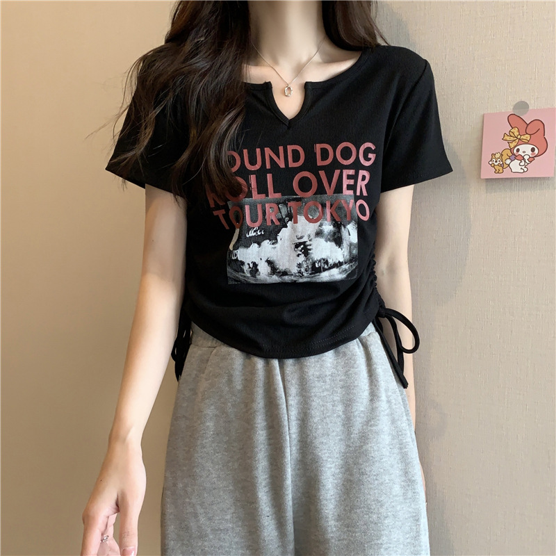 罗纹抽绳高腰遮肚短款上衣t恤女夏季辣妹炸街设计感修身显瘦