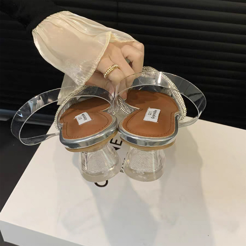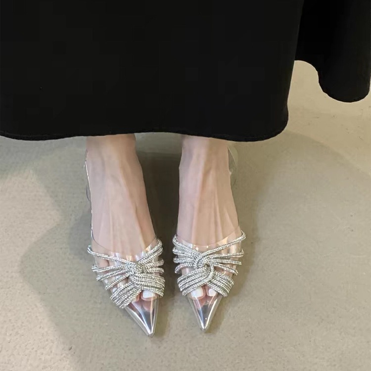 洋气时尚水晶鞋透明尖头水钻半拖凉鞋女粗跟夏天配裙子气质高跟鞋