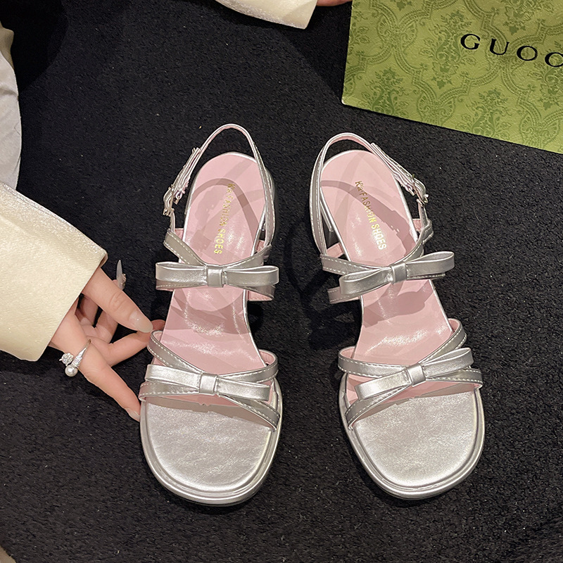 法式银色仙女风粗跟凉鞋女新款夏季外穿配裙子温柔风晚晚鞋子