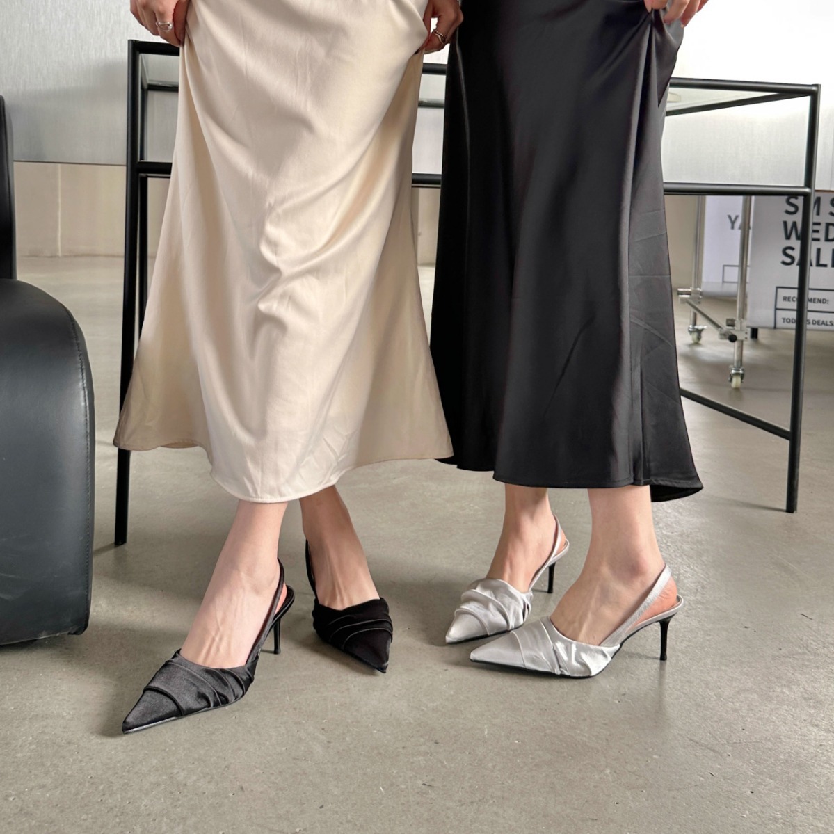 新中式绝美凉鞋女夏季新款法式尖头后空单鞋缎面一字带高跟鞋黑色