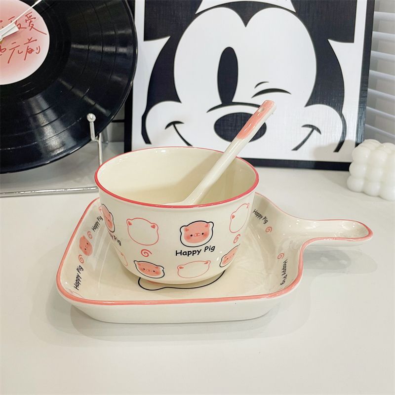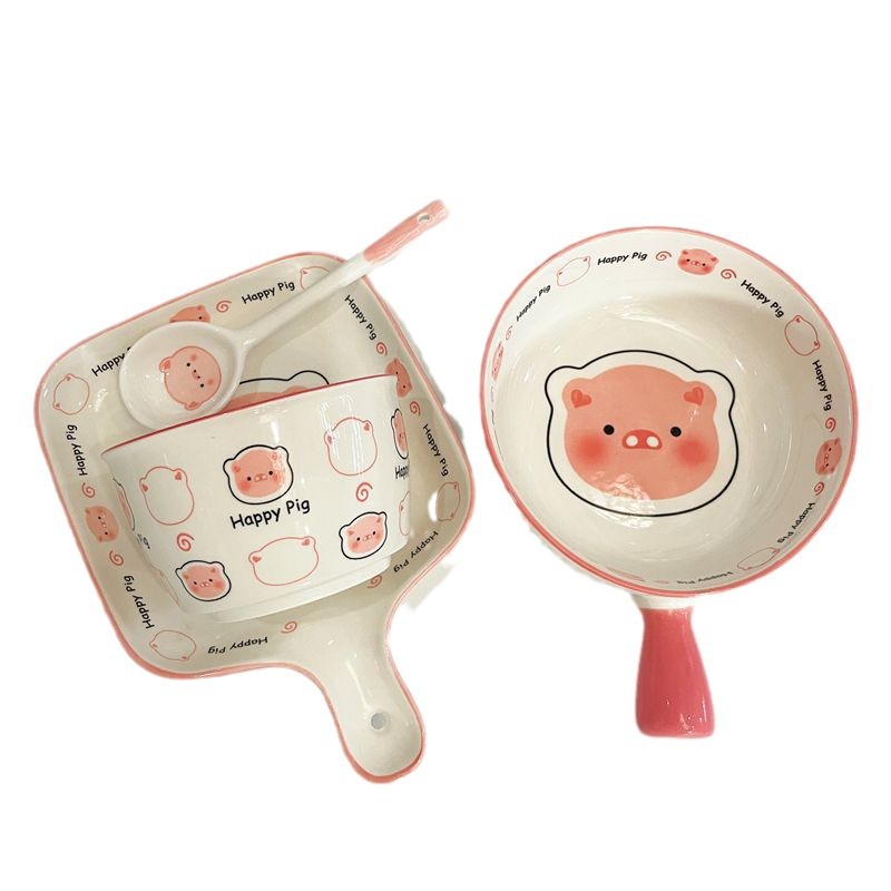 happy猪猪一人食可爱少女心餐具手把碗焗饭碗陶瓷釉下彩餐具套装