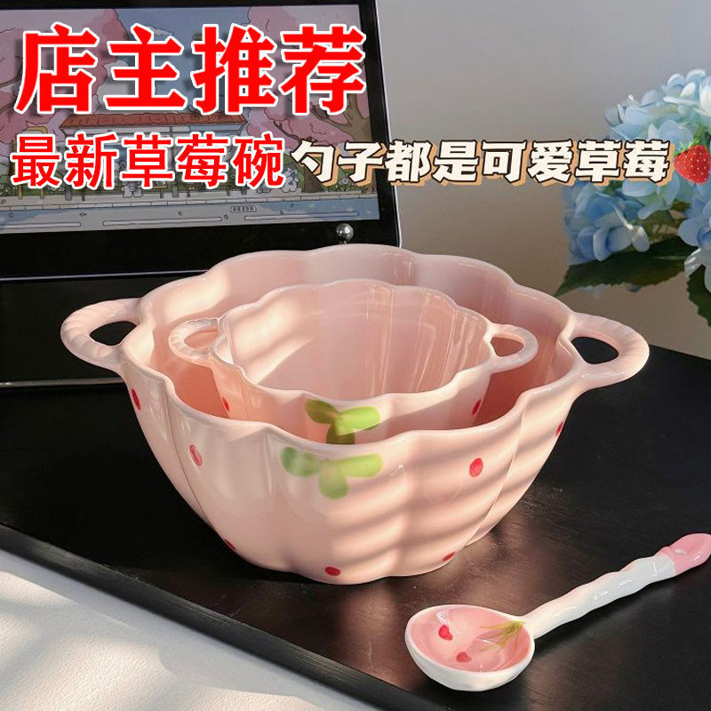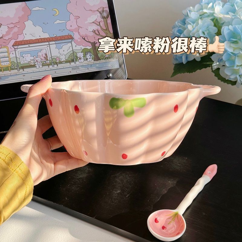 双耳汤碗少女心草莓粉色系大容量螺蛳粉碗家用大汤碗宿舍泡面碗勺