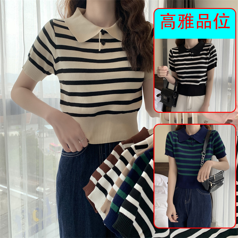 短袖T恤女设计感夏季韩系chic港味别致正肩修身条纹针织上衣ins潮
