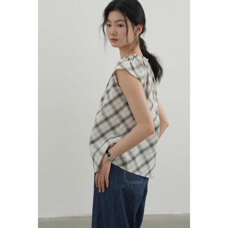 夏日光影 法式复古黑白格子T恤减龄小衫短款小飞袖独特别致上衣女