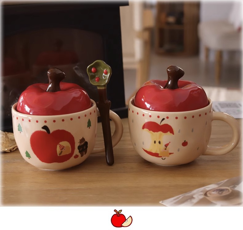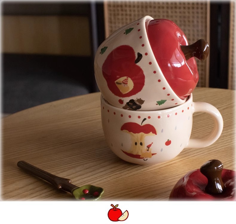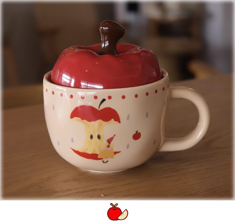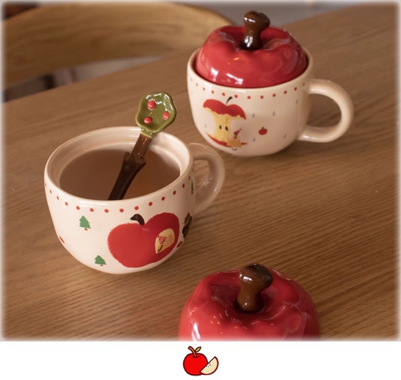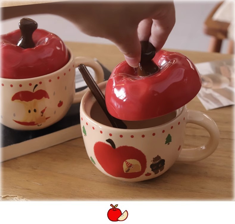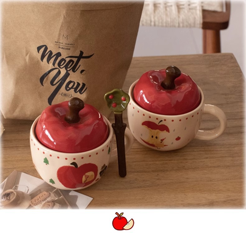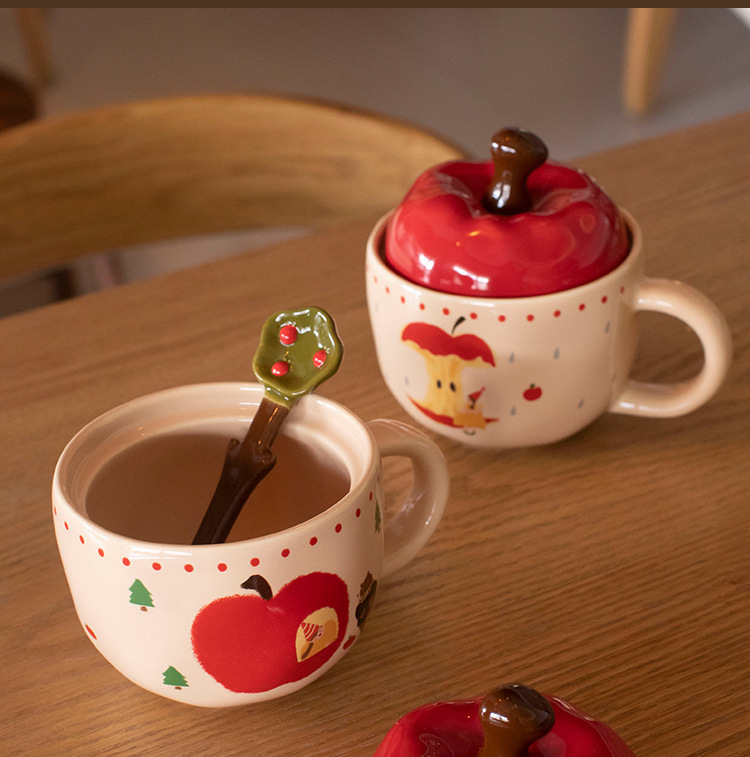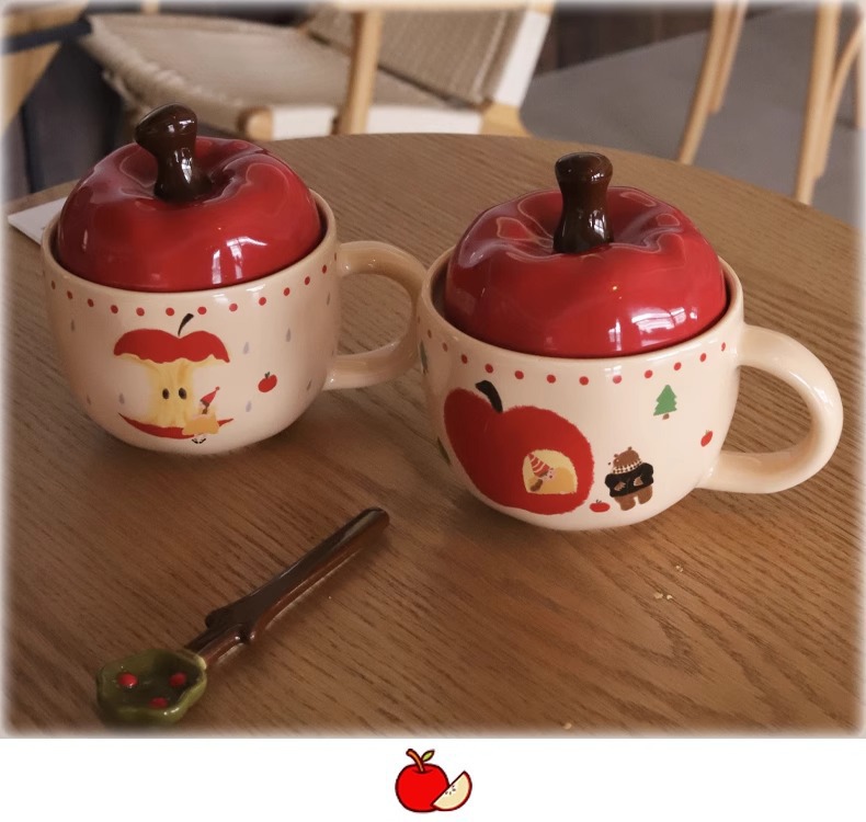 复古女孩苹果杯带盖带勺子马克杯送闺蜜生日礼物陶瓷杯家用喝水杯