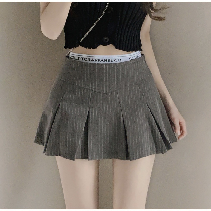韩国chic黑色条纹百褶裙女韩版甜辣弹力字母腰百搭显瘦迷你短裙潮