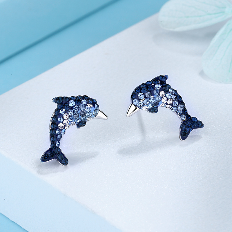 s925纯银蓝色海豚耳钉女清新甜美渐变色镶钻耳环气质森系