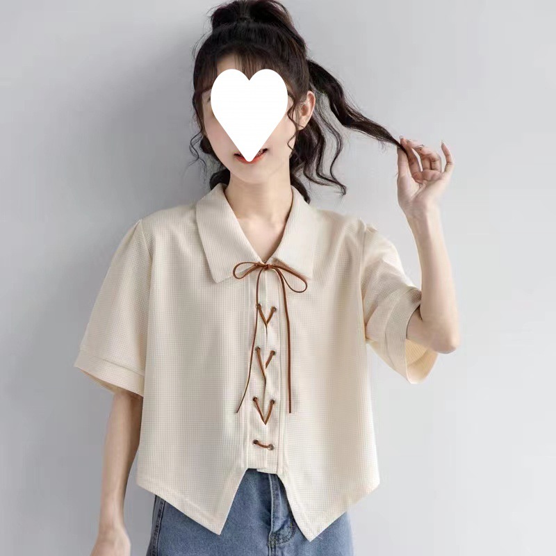 衫女绑带设计感夏季新款华夫格衬衣polo领短款上衣