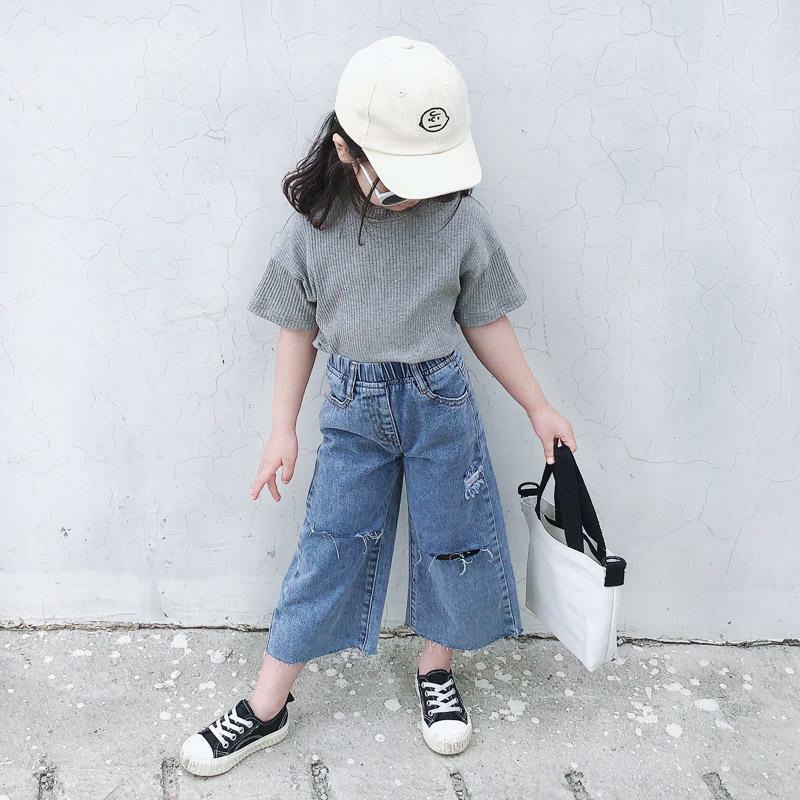 夏季女童套装宝宝网红洋气儿童个性潮韩版短袖T恤破洞牛仔阔腿裤