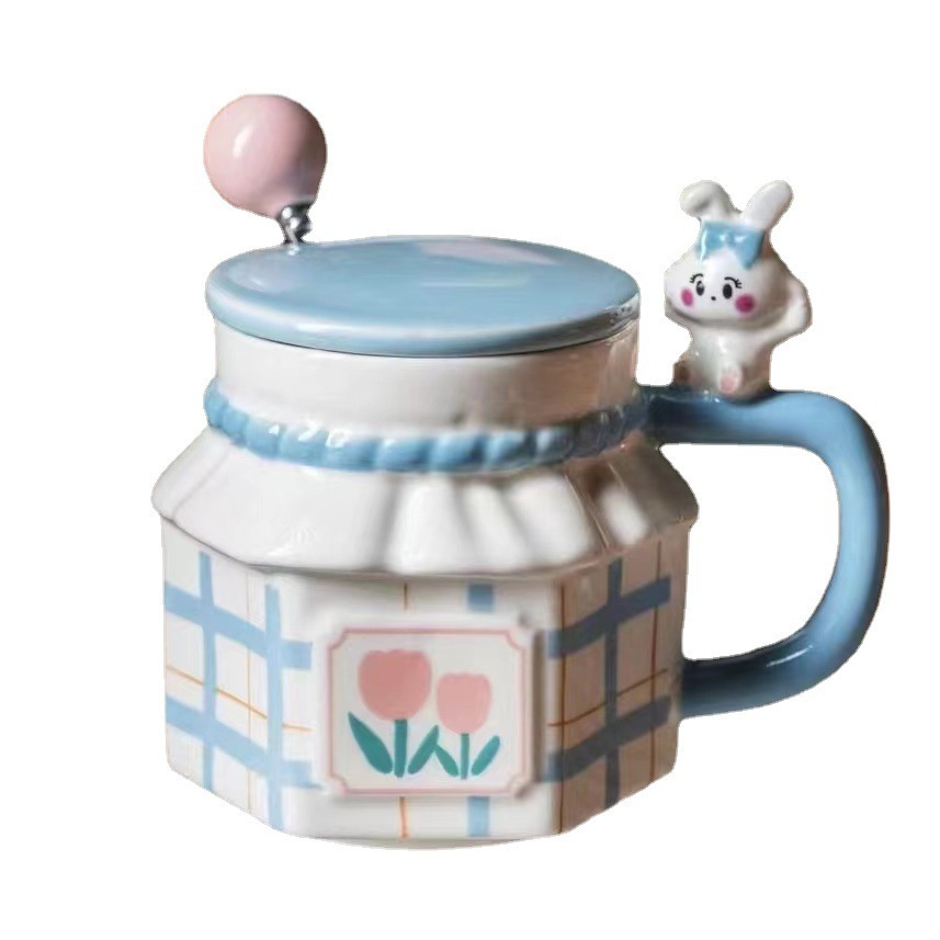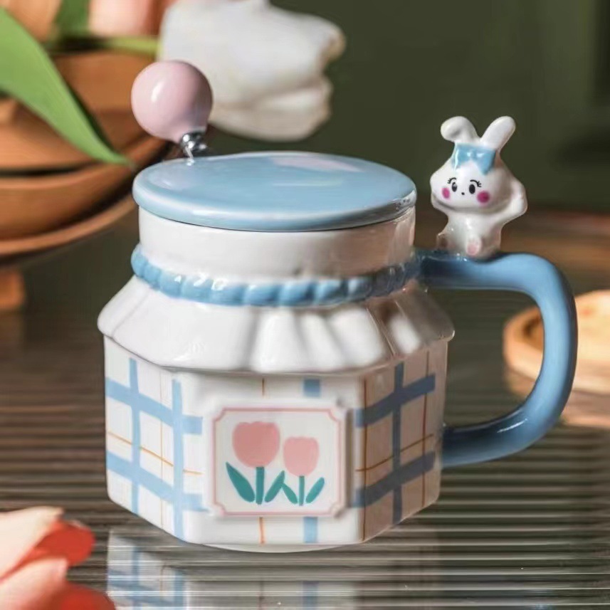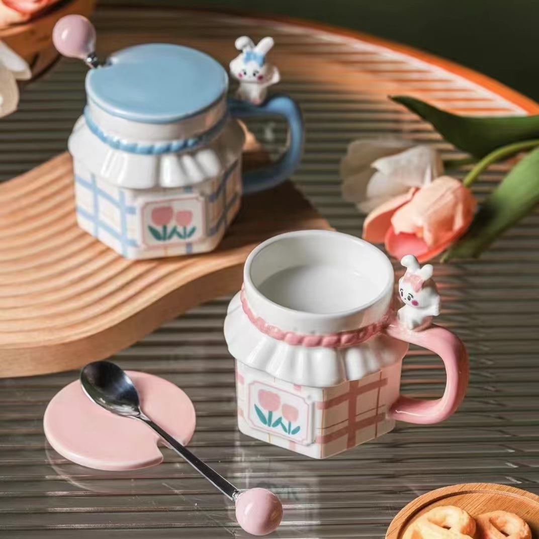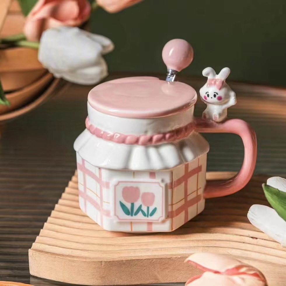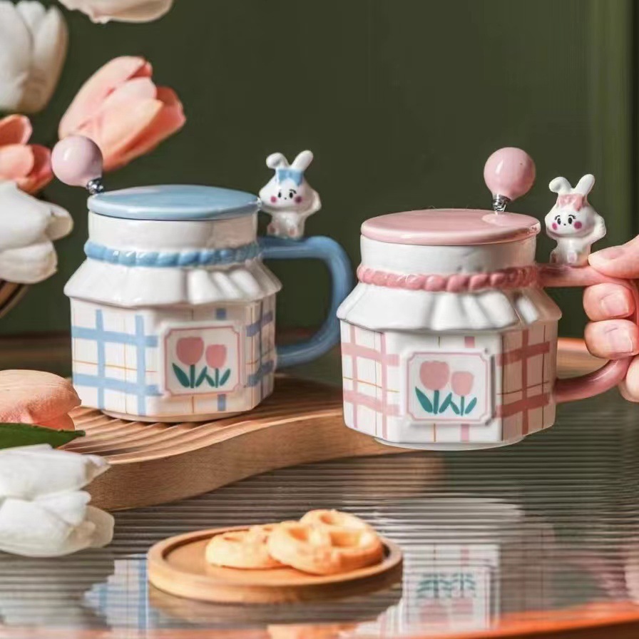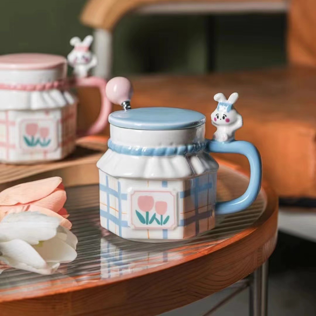 ins风兔子情侣郁金香陶瓷杯可爱 伴手礼生日礼物水杯马克杯带盖勺