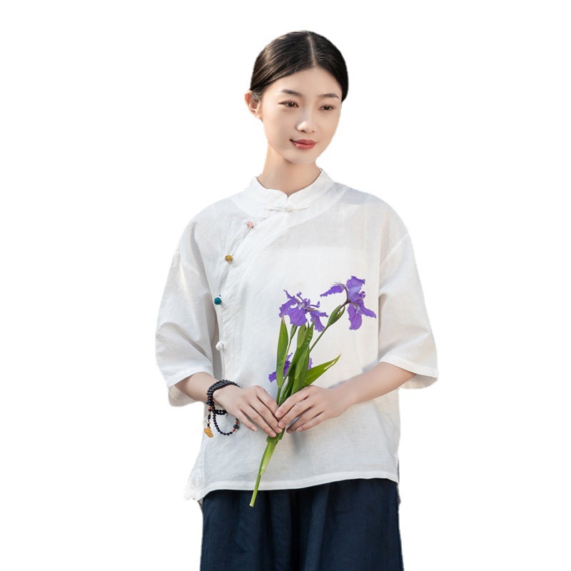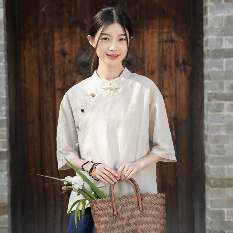 夏新品棉麻女装复古立领偏襟薄款拼色盘扣短袖上衣女茶服衬衫