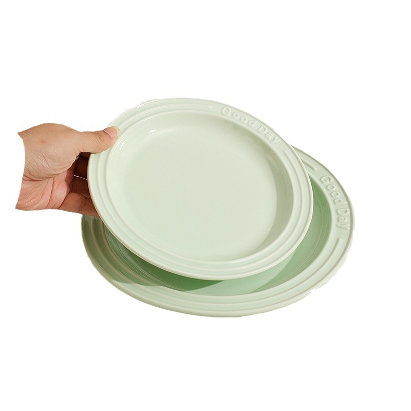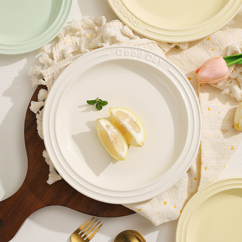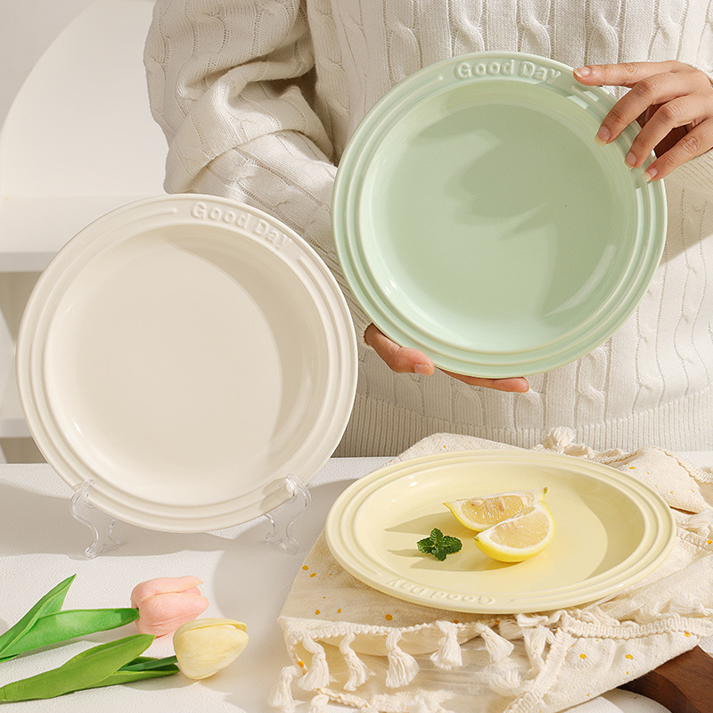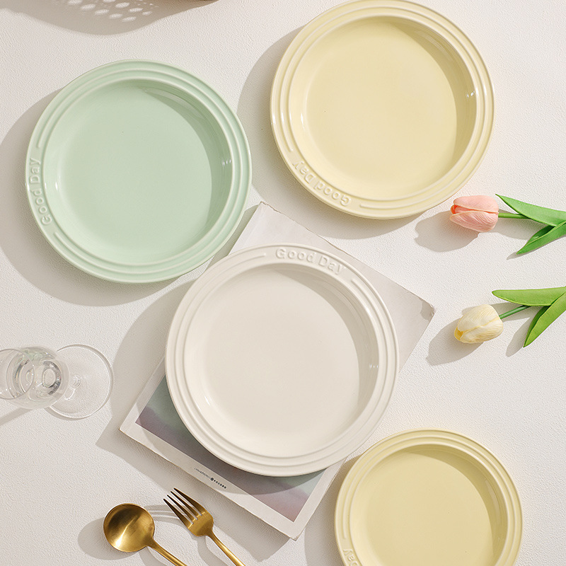 纯色陶瓷盘子ins奶油色釉下彩浮雕字母餐盘 家用西餐意面盘甜品盘