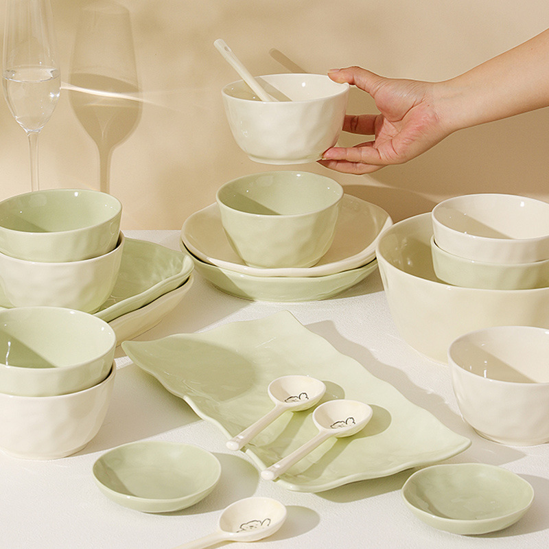 纯色手捏纹陶瓷碗碟釉下彩家用饭碗汤碗盘子鱼盘实用餐具组合套装