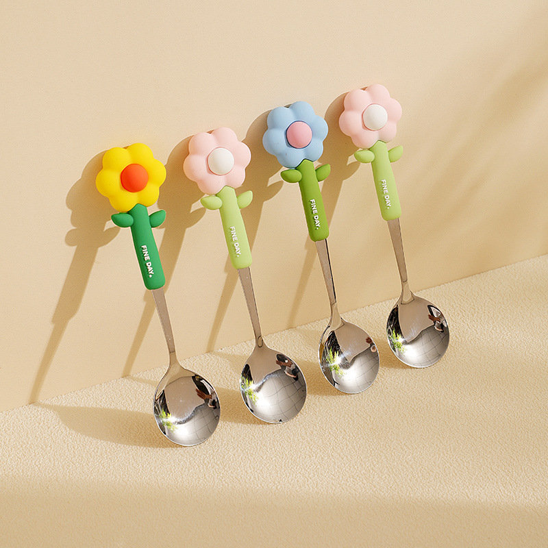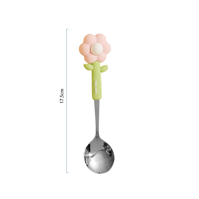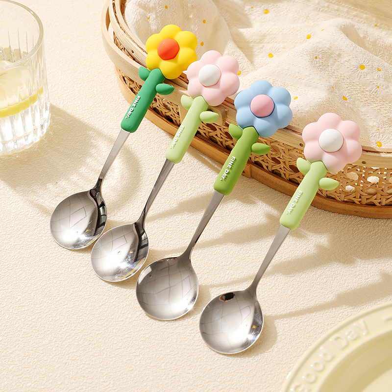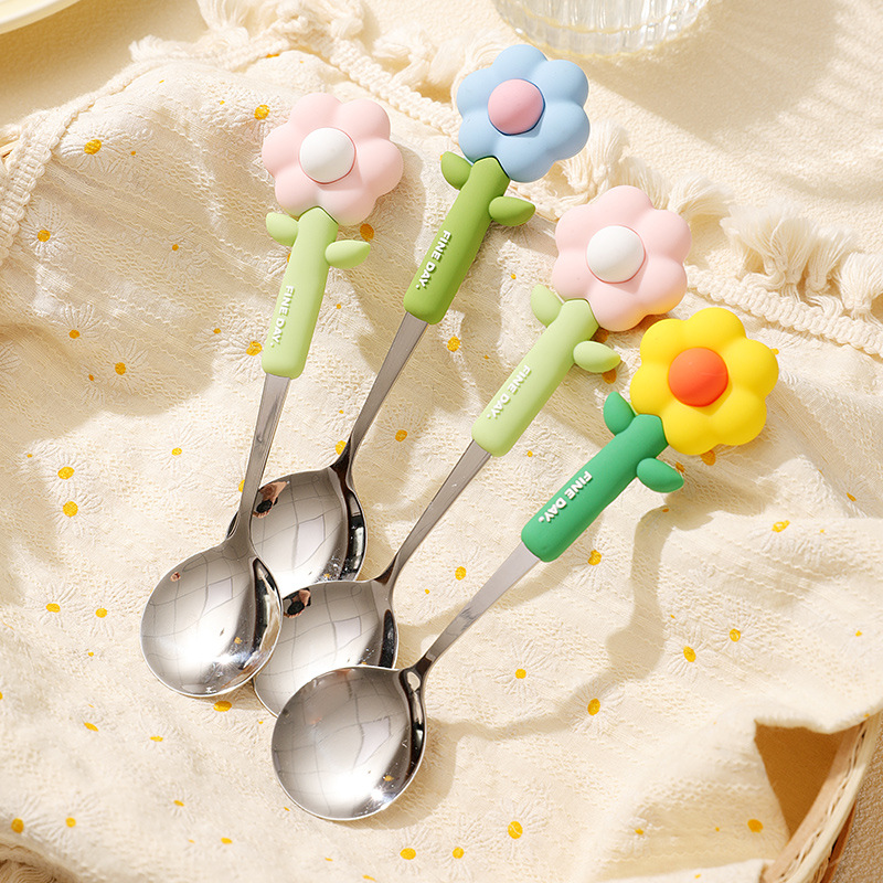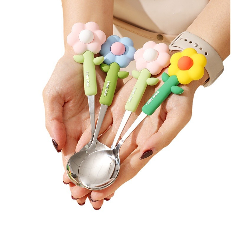 可爱花朵勺子304不锈钢矽胶手柄防摔宝宝用汤匙 创意家用吃饭勺子