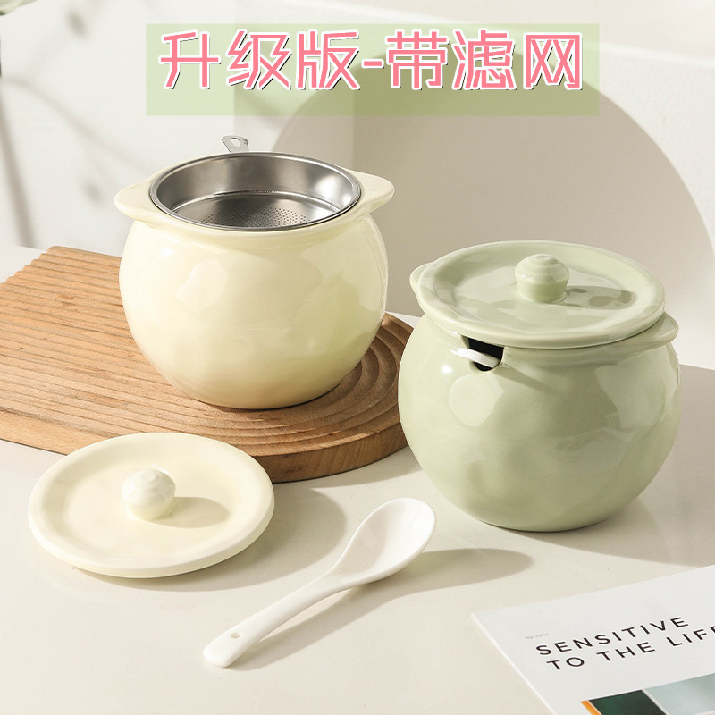 陶瓷猪油罐家用耐高温带滤网带盖荤油罐厨房盐罐子调料辣椒专用罐