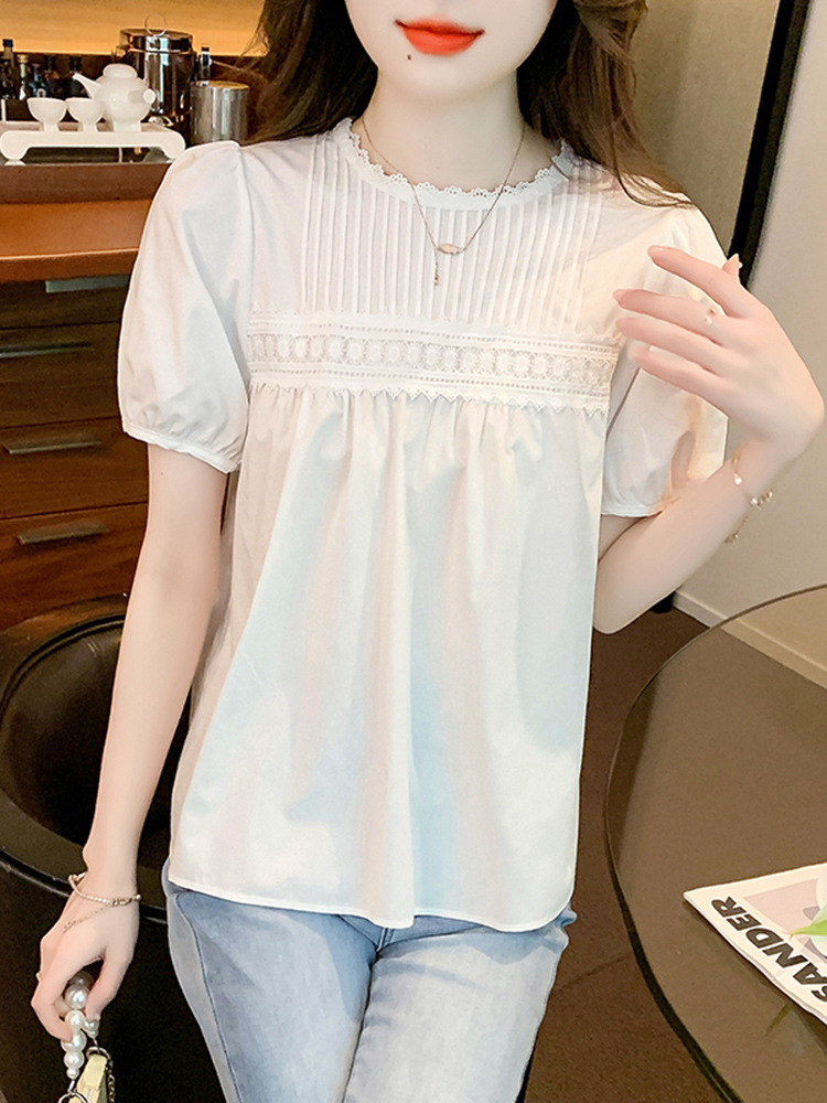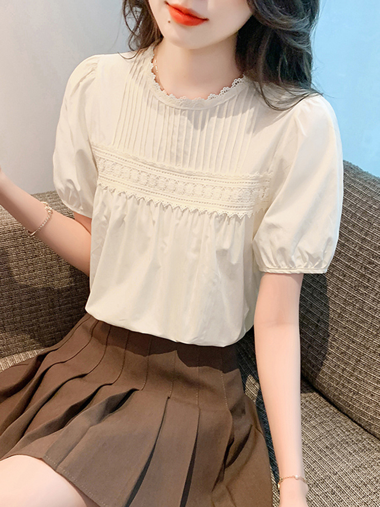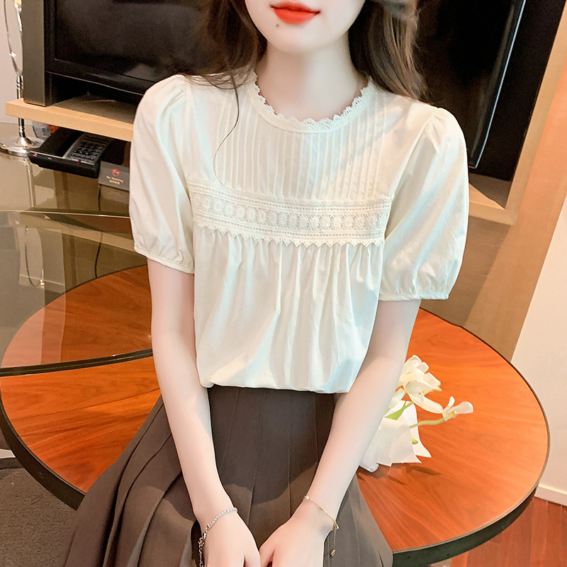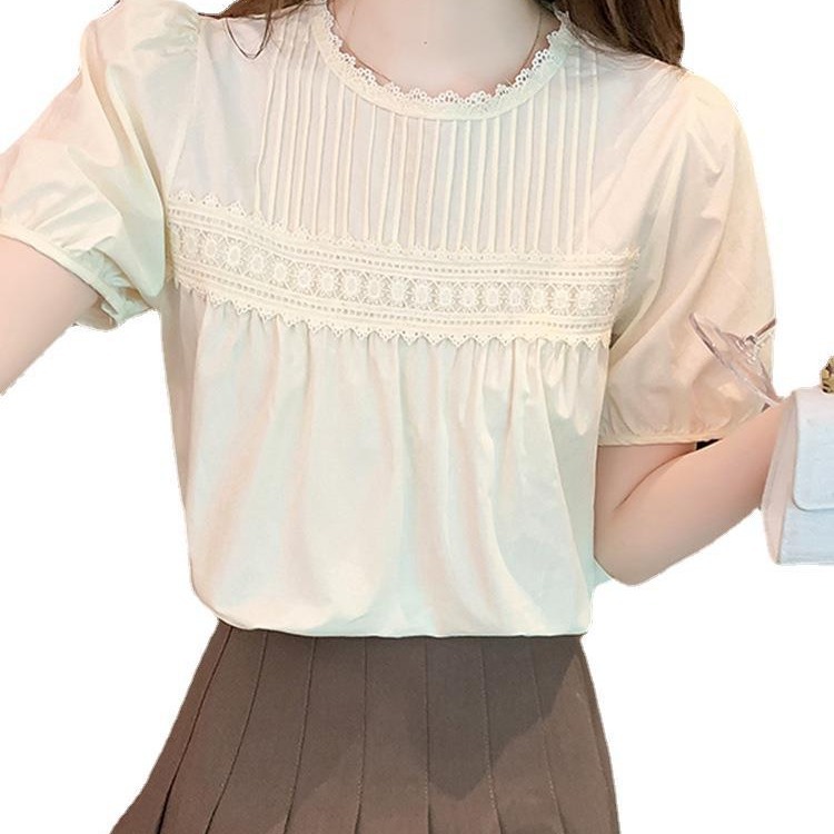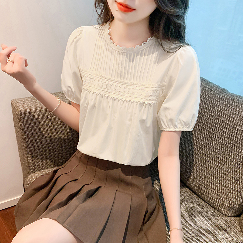 法式时尚圆领短袖衬衫女装夏季宽松显瘦时尚感设计套头上衣夏
