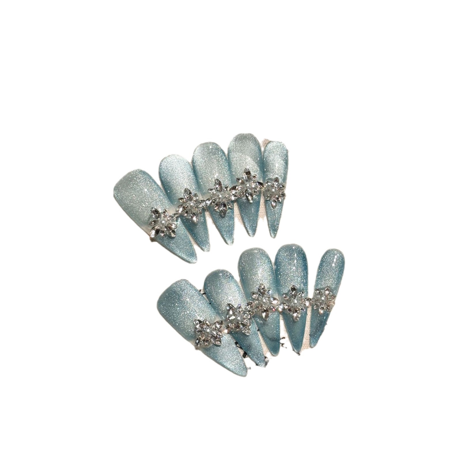 艺禾法式浪漫纯欲风冰透蓝碎钻猫眼法式爆闪显白美甲成品穿戴甲