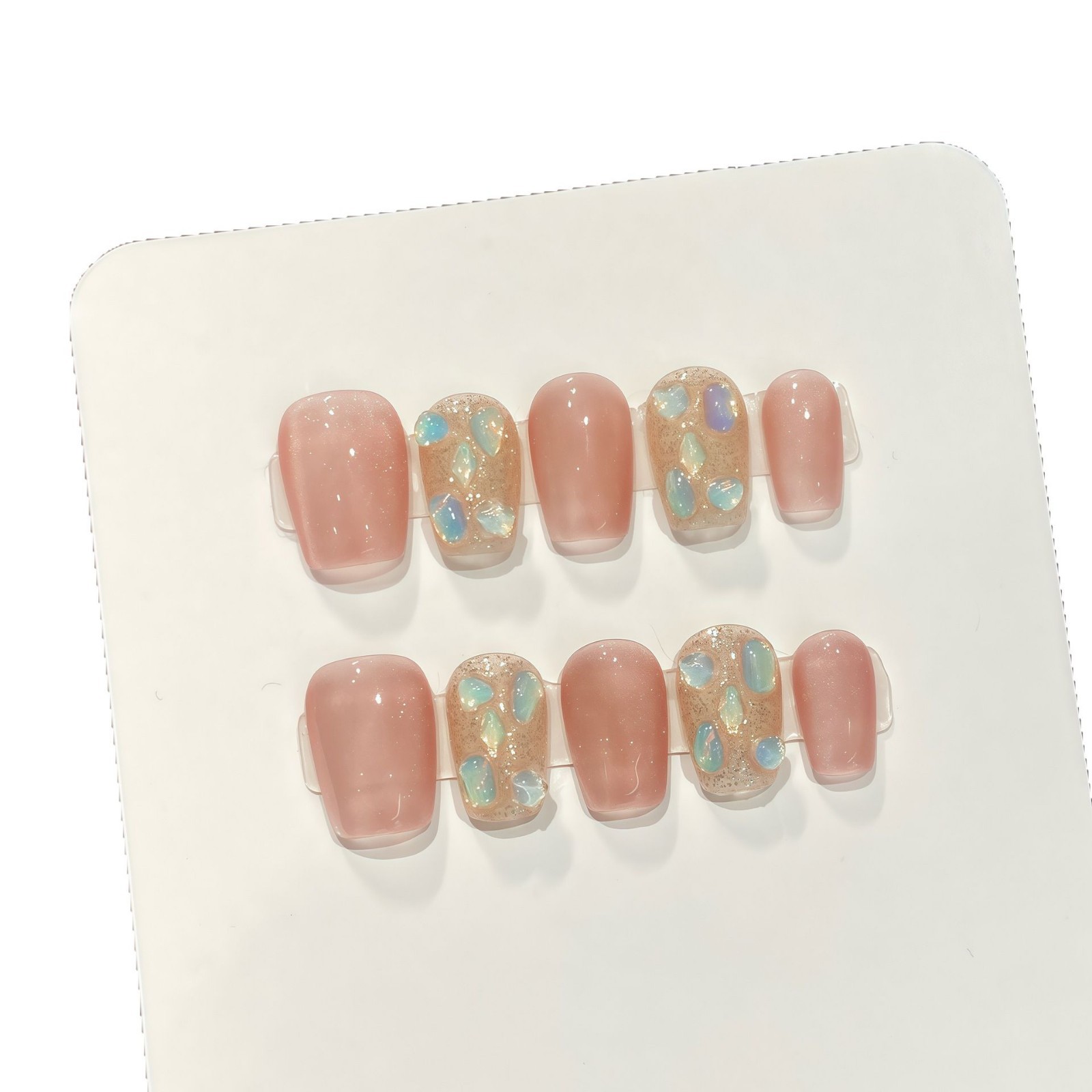 艺禾美甲 清透茉莉花茶爆闪瓷白猫眼美甲穿戴甲温柔显白全钻碎钻