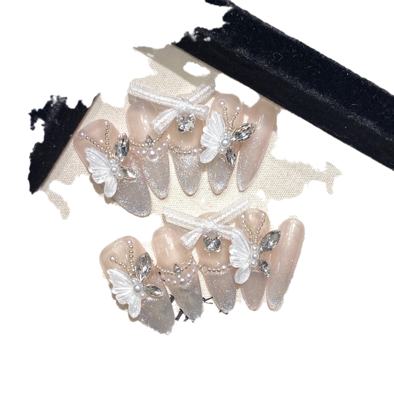 玫瑰森林山谷幽蝶纯手工穿戴甲白色蝴蝶法式猫眼显白美甲成品长款