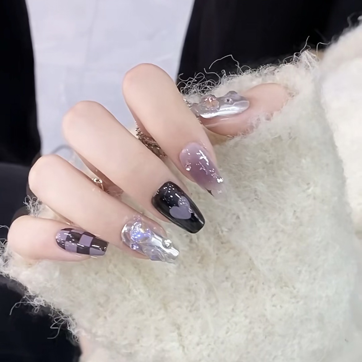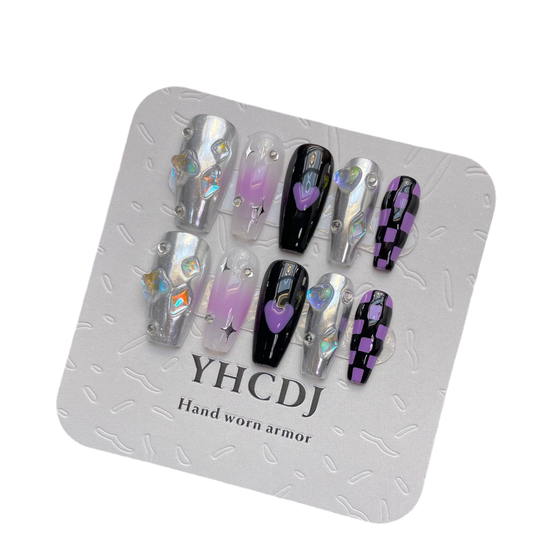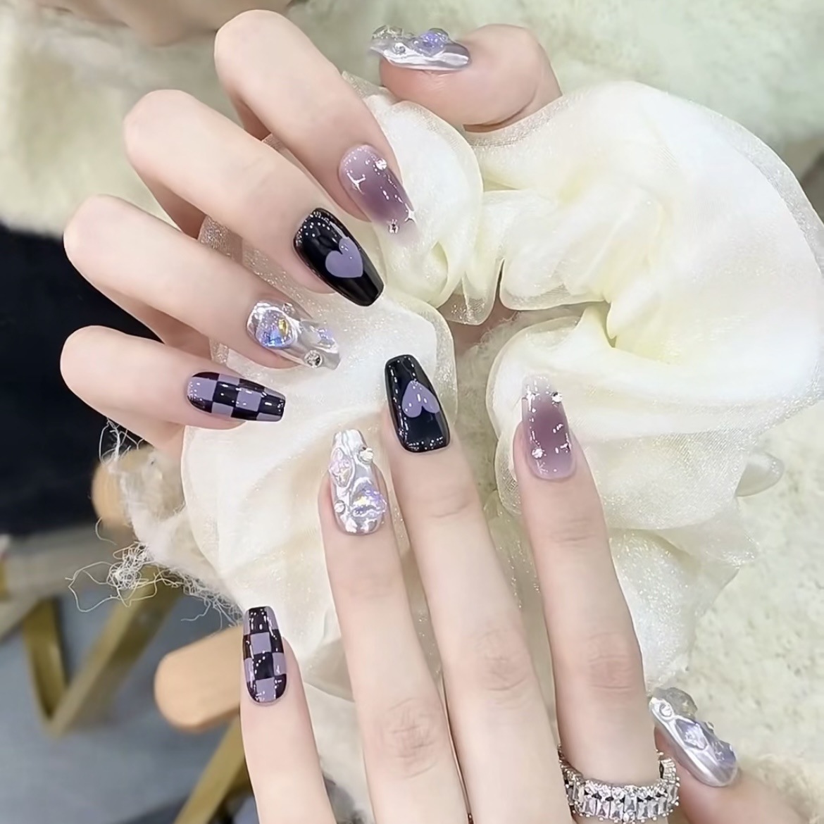 漫紫|一秒甜心辣妹系列黑紫棋盘格手工穿戴甲魔镜粉爱心星星美甲