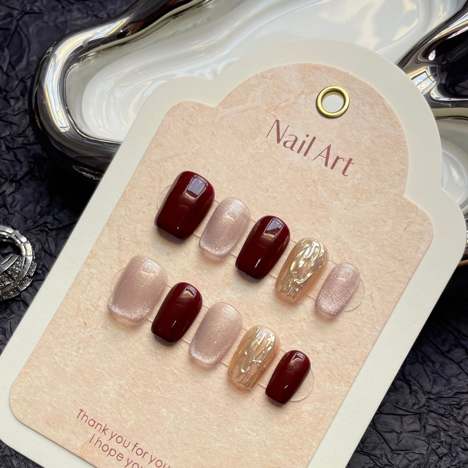港风美人纯手工穿戴甲秋冬款气质轻奢车厘子红显白鎏金猫眼新娘甲