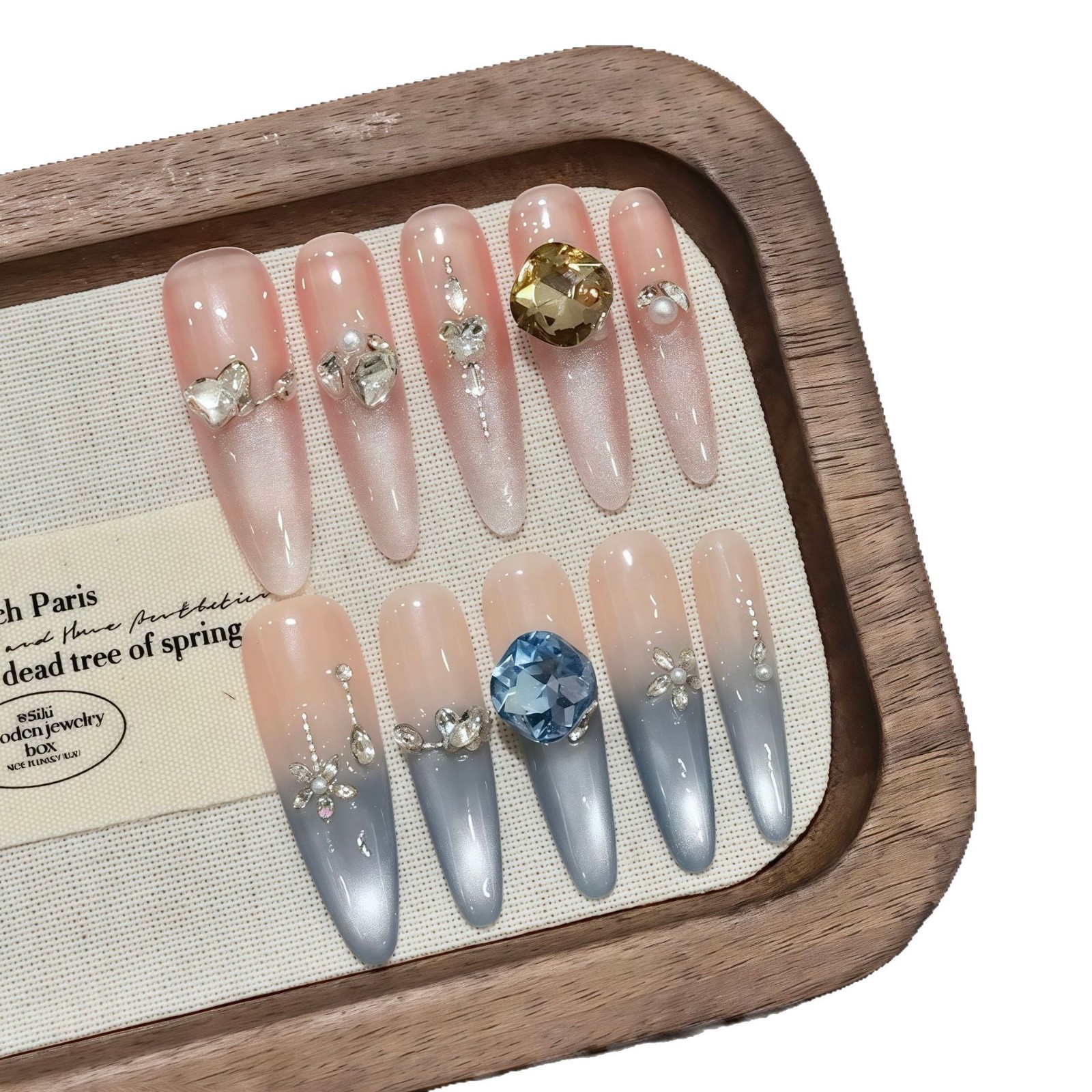 艺禾美甲 鸳鸯粉蓝猫眼纯欲渐变堆钻气质爆闪显白长款手工穿戴甲