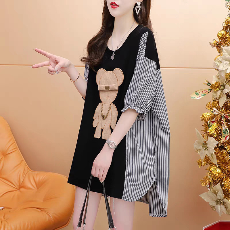 设计感拼接短袖T恤女中长款新款夏季洋气减龄宽松慵懒风上衣
