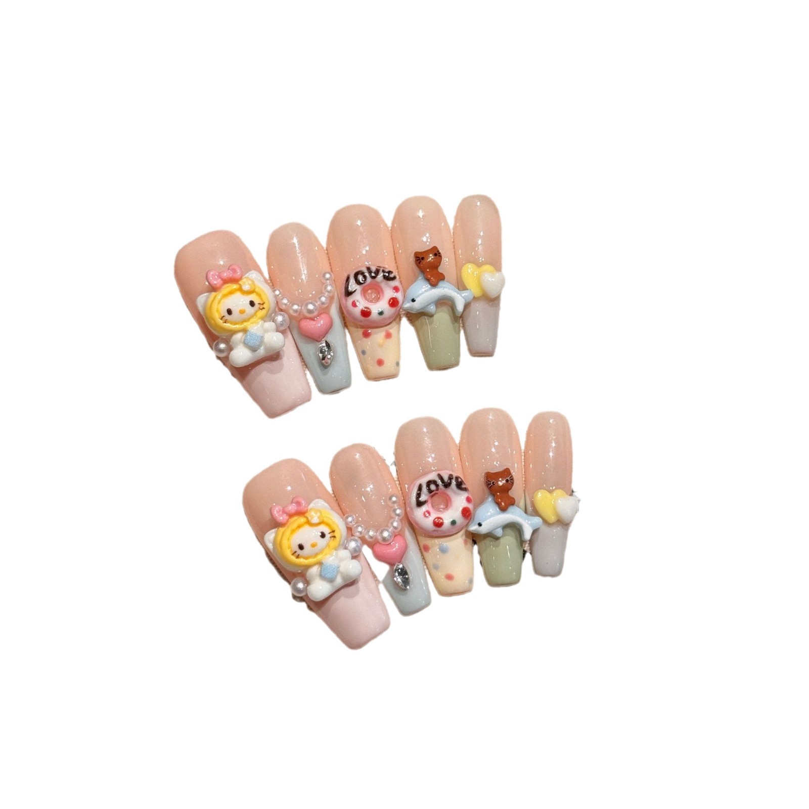 艺禾超长梯清新甜美海洋甜甜圈猫海豚爱心立体KT猫纯手工穿戴美甲