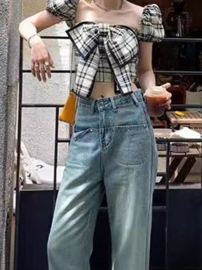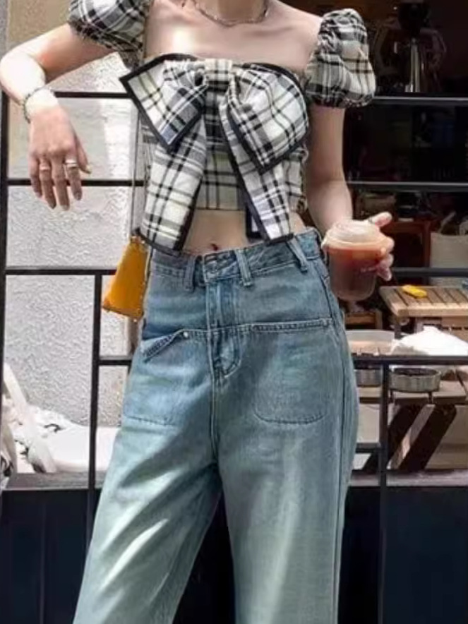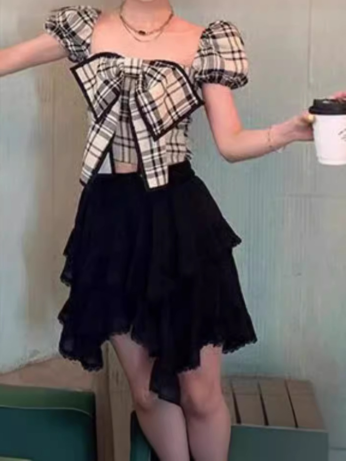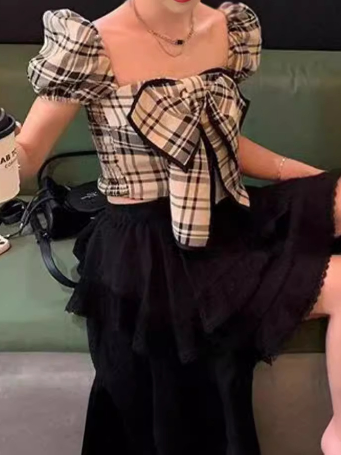 春季 蝴蝶结格子衬衫女新款仙女上衣超仙甜美法式短袖小衫