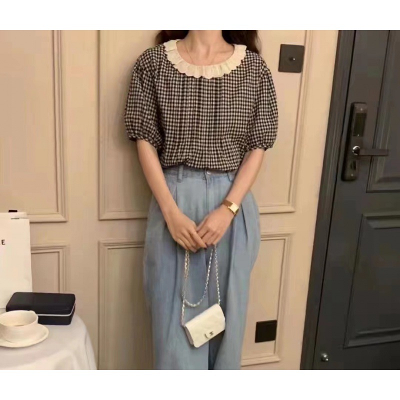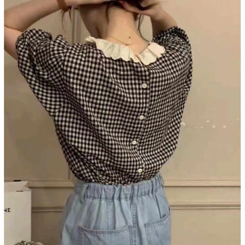 韩国东大门甜美蕾丝花边领减龄泡泡袖前后两穿格子衬衫女