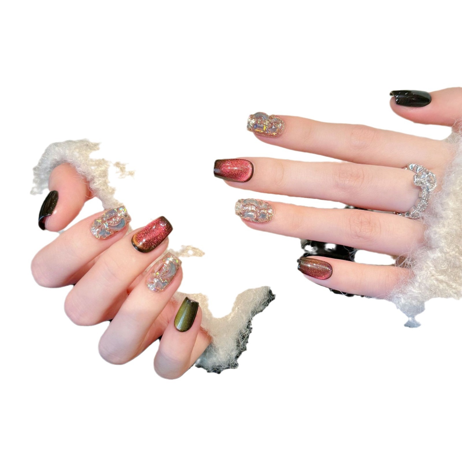艺禾 三色渐变猫眼变色龙美甲爆闪满钻重工秋冬短款穿戴甲可拆卸