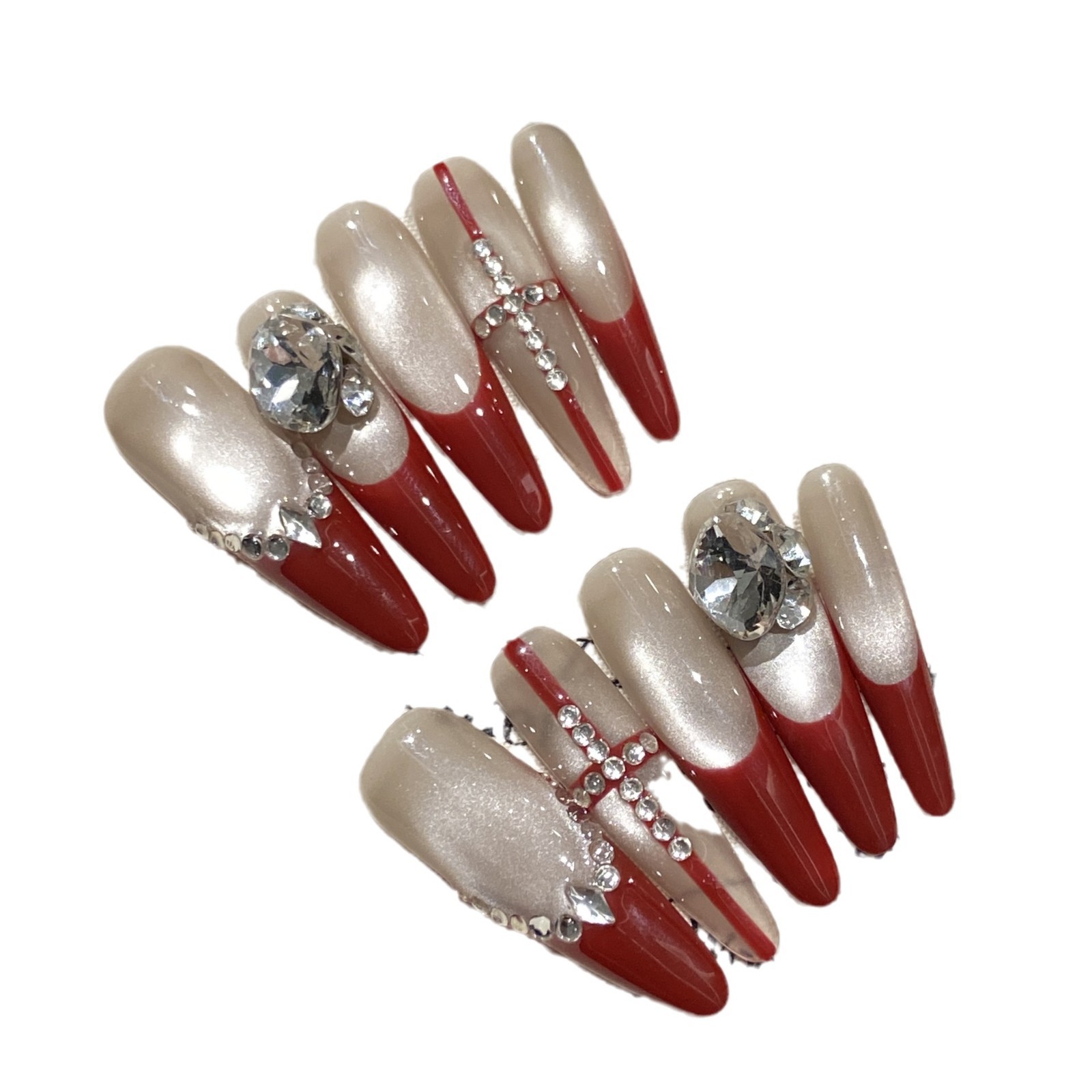 艺禾红色法式长款十字架拼钻新年战甲款猫眼高级手工美甲穿戴甲