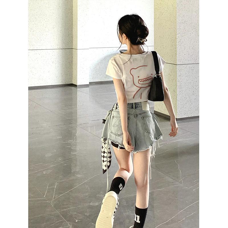 火龙果色圆领短款短袖新款女装小众设计感多巴胺穿搭正肩上衣